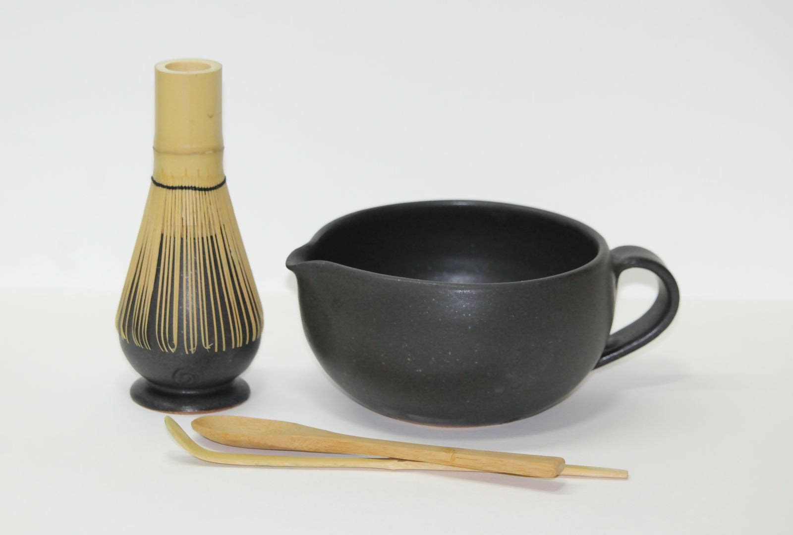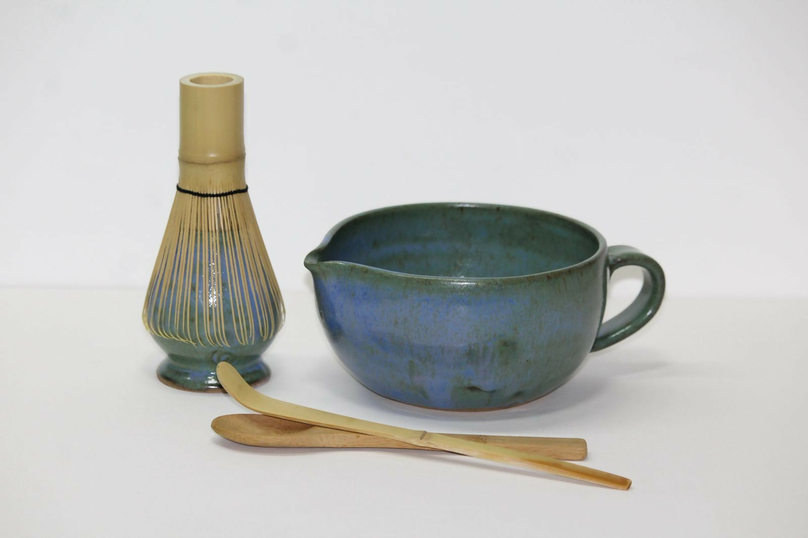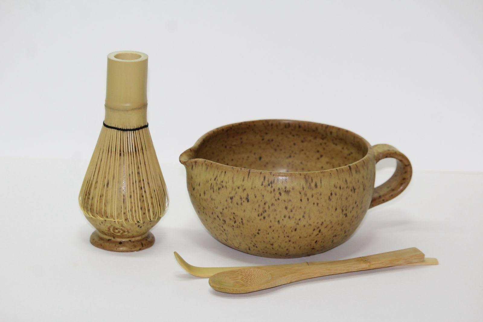 Bowl y porta cepillo en cerámica gres, cepillo, cuchara y paleta en bambú