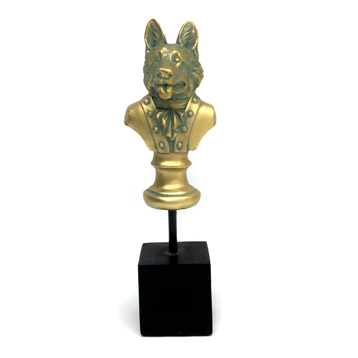 La figura representa la parte superior de un lobo, enfocándose en su cabeza y torso. El lobo está vestido con un traje elegante, lo que añade un toque divertido y sorprendente a la figura.
