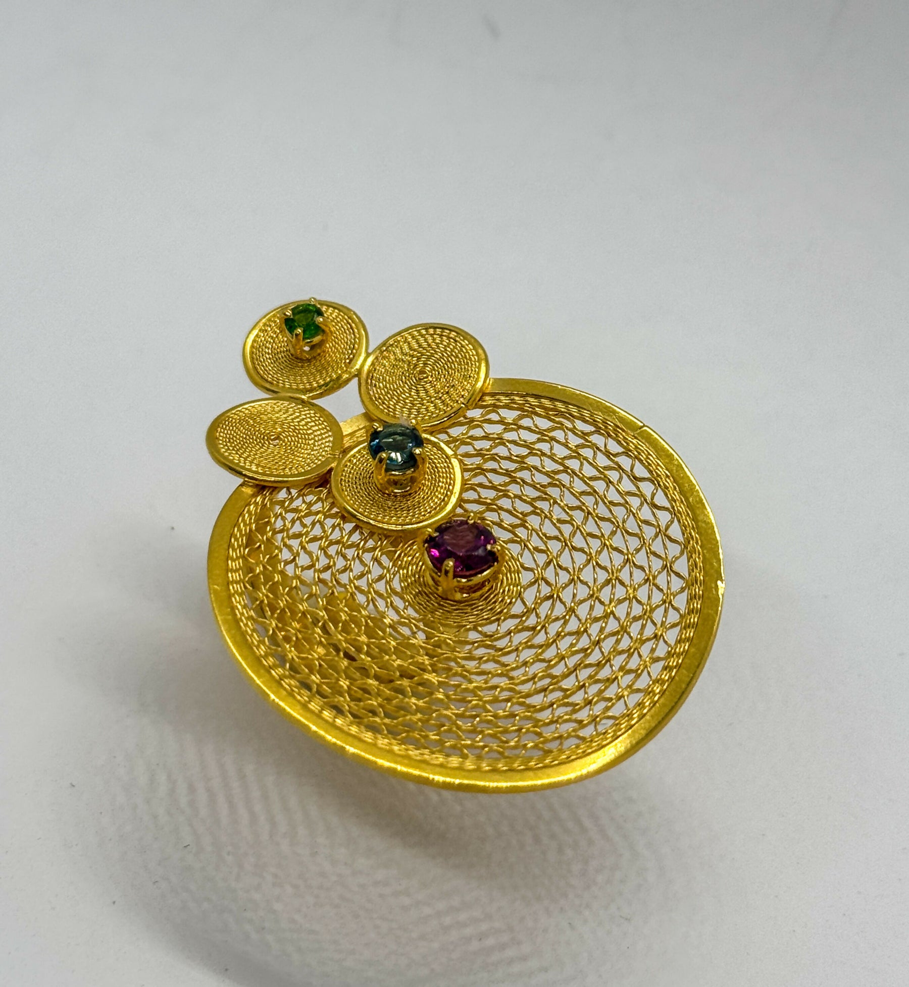 Anillo de Filigrana Jardín de Luz. Este anillo es un pequeño universo de colores, donde la filigrana en plata bañada en oro de 24k entrelaza delicadamente la fuerza de tres gemas vibrantes: la rodolita con su tono rosado intenso, el topacio de claridad etérea y el diópsido de cromo, profundo como un bosque al amanecer.