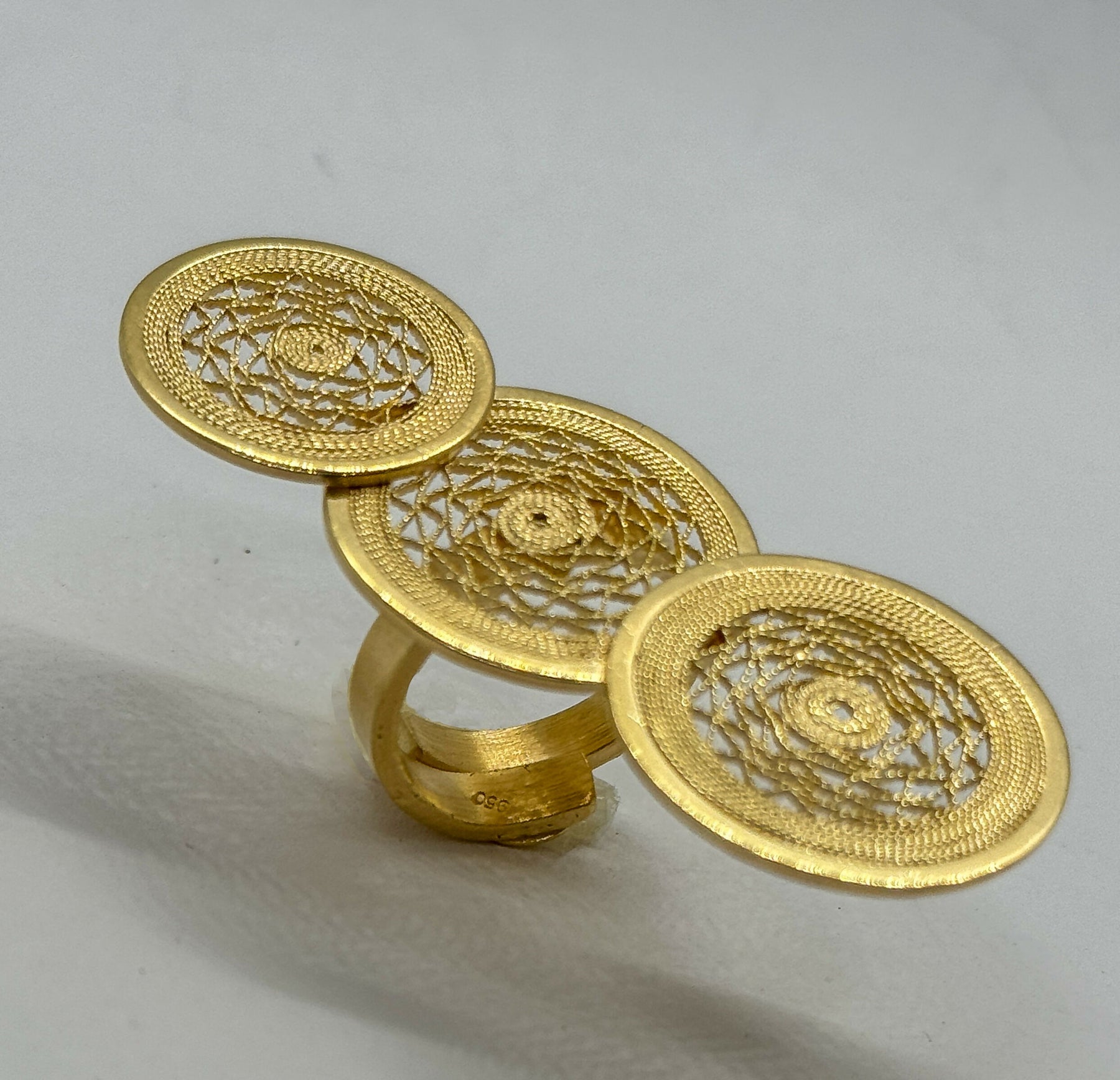 Tres delicados círculos de filigrana se alinean en este anillo como constelaciones en equilibrio, tejidos a mano en plata fina y bañados en oro amarillo 18k. Cada uno conserva su singularidad, pero juntos crean una unidad armónica, un gesto de conexión y continuidad.