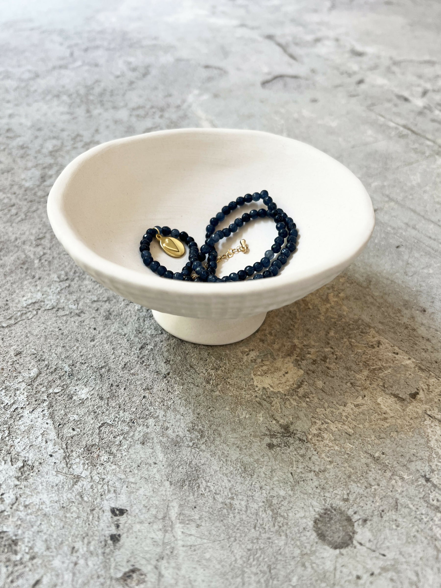 Pocillo de cerámica de tamaño pequeño, generalmente utilizada como recipiente decorativo. Su color blanco transmite simplicidad y elegancia, mientras que la textura agrega un toque de interés visual.