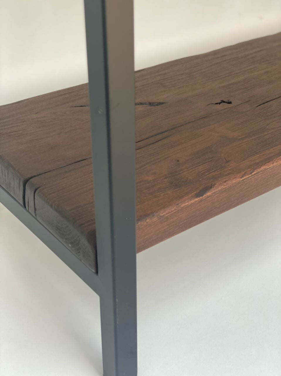 Estructura de fierro y madera de raulí. El diseño de este arrimo deja a la vista la fibra natural de la madera, entregando un equilibrio perfecto entre lo rústico y lo elegante.