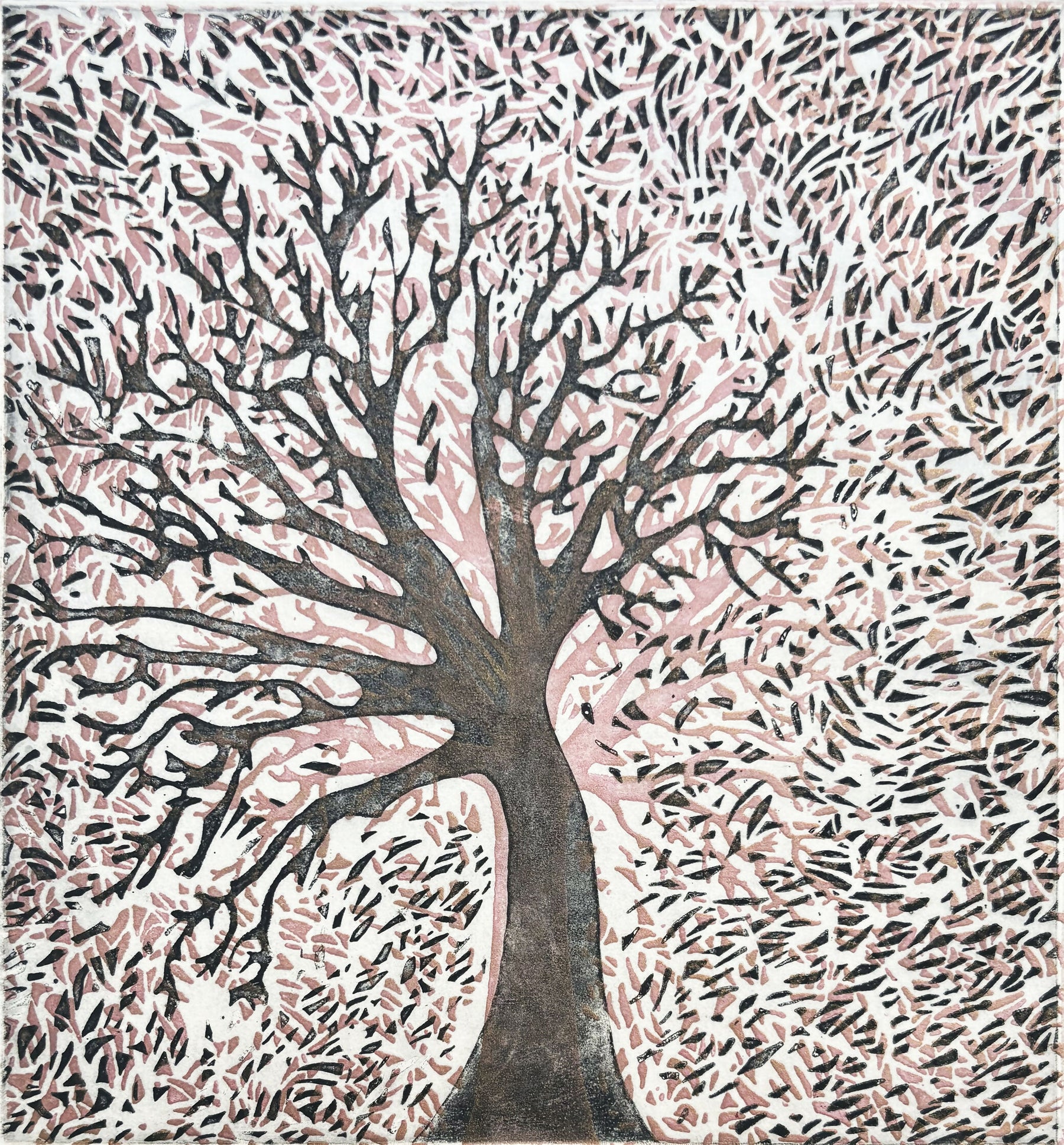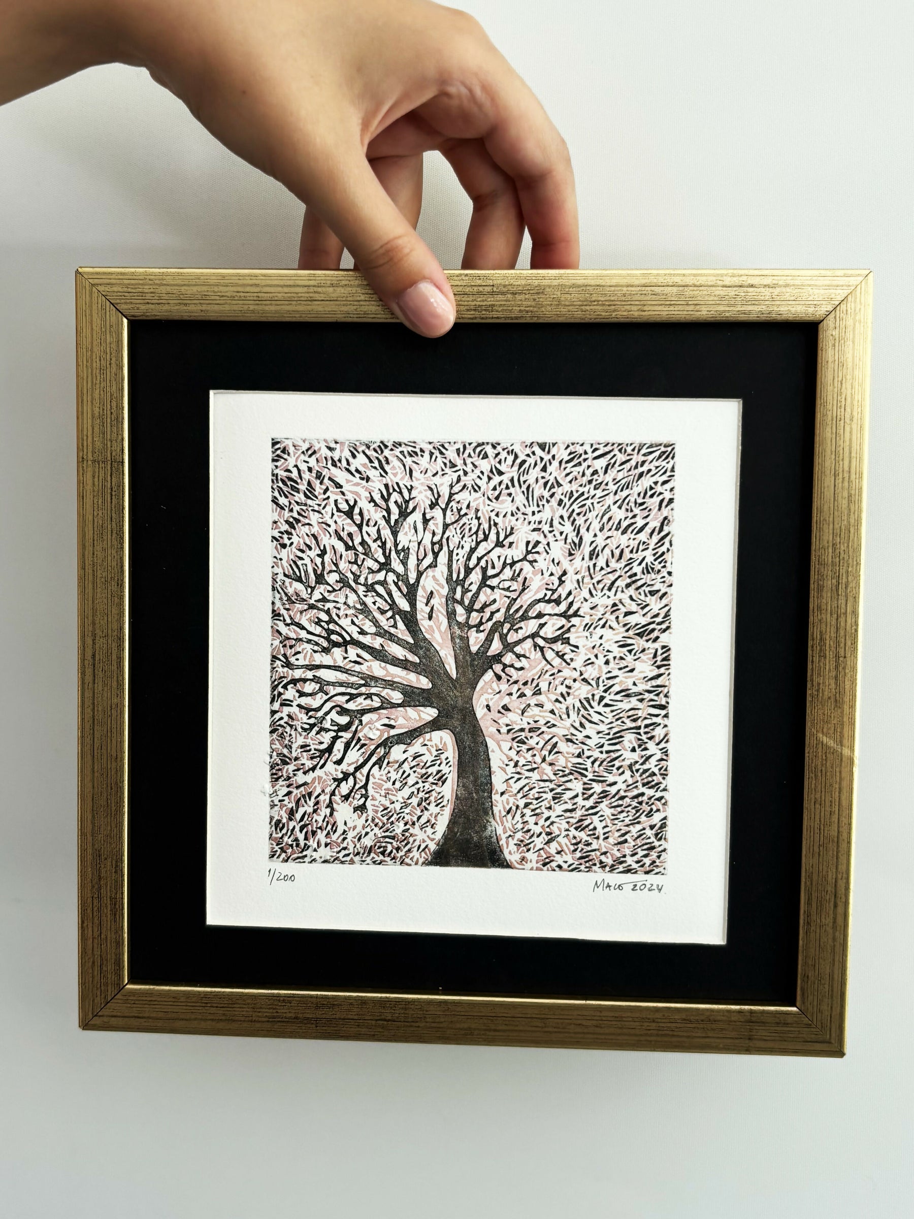Esta obra es un giclée fine art sobre papel de algodón, reproducción fiel de un grabado original en tonos dorados y rosados.