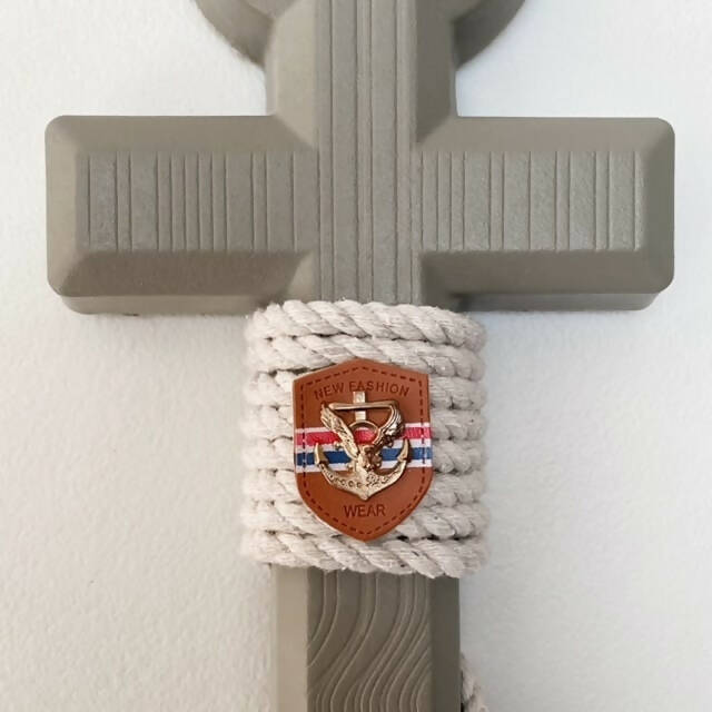 Una atractiva pieza mural de madera con forma de ancla y soga, ideal para decorar espacios náuticos o dar un toque marinero a cualquier pared.