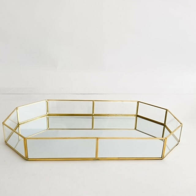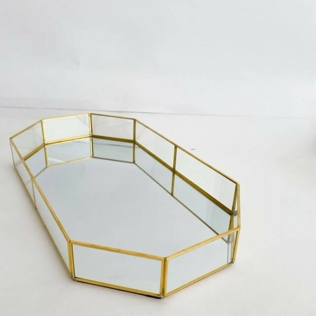 Pequeña bandeja espejada en tono dorado con forma rectangular, ideal para presentar pequeños objetos decorativos con elegancia.