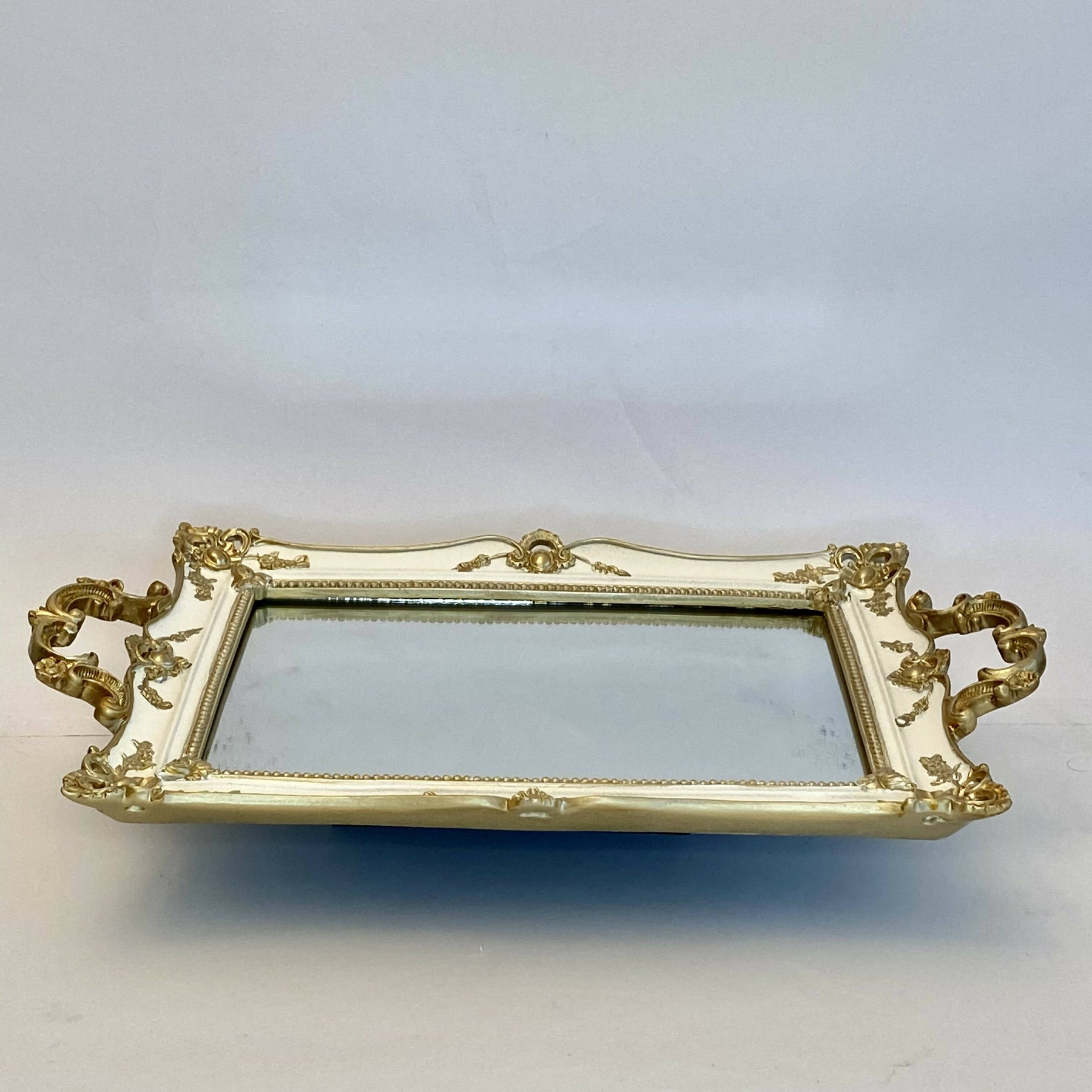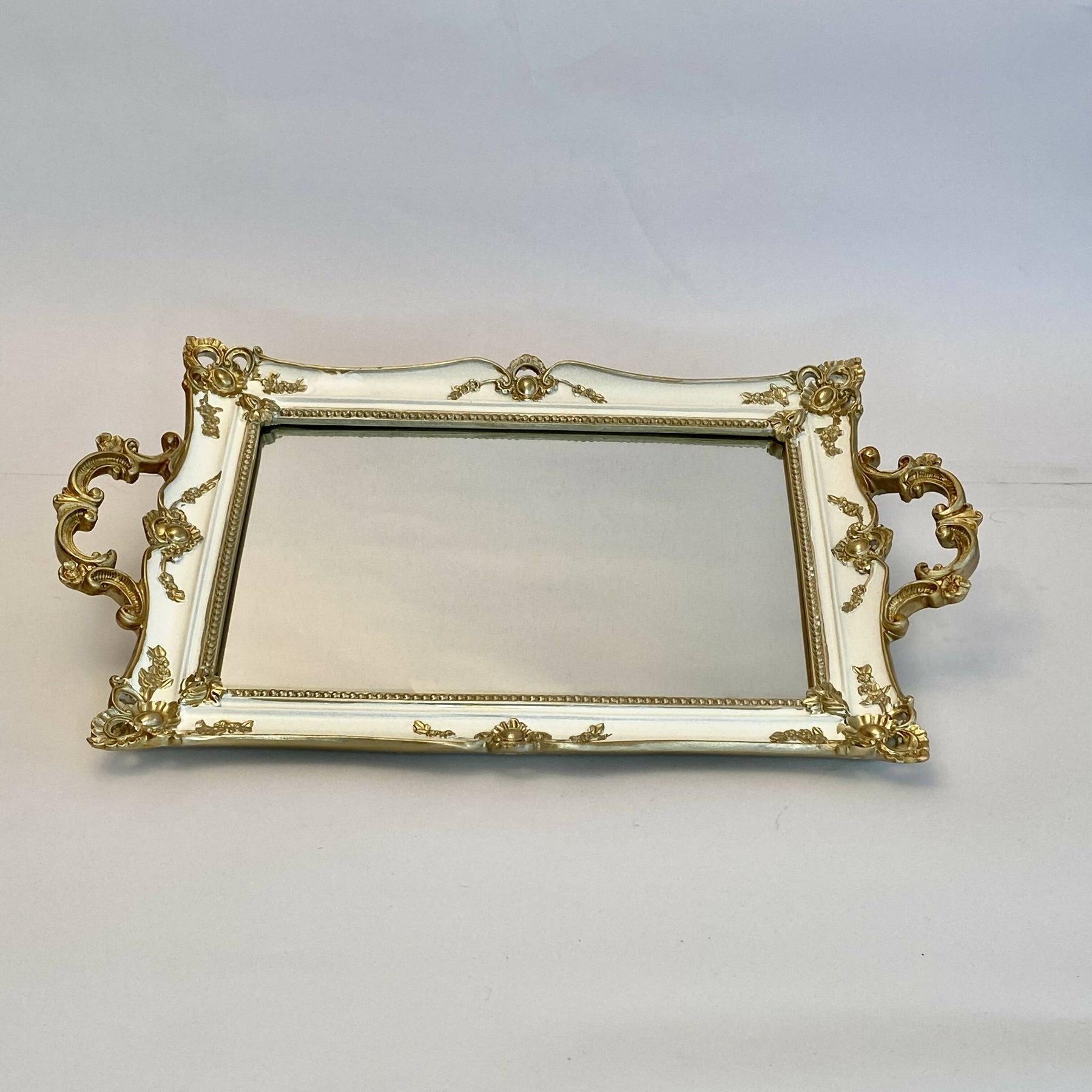 Una bandeja rectangular con un diseño único que combina la elegancia del blanco y el dorado, acentuada por un espejo. Sus asas proporcionan comodidad y estilo al mismo tiempo.