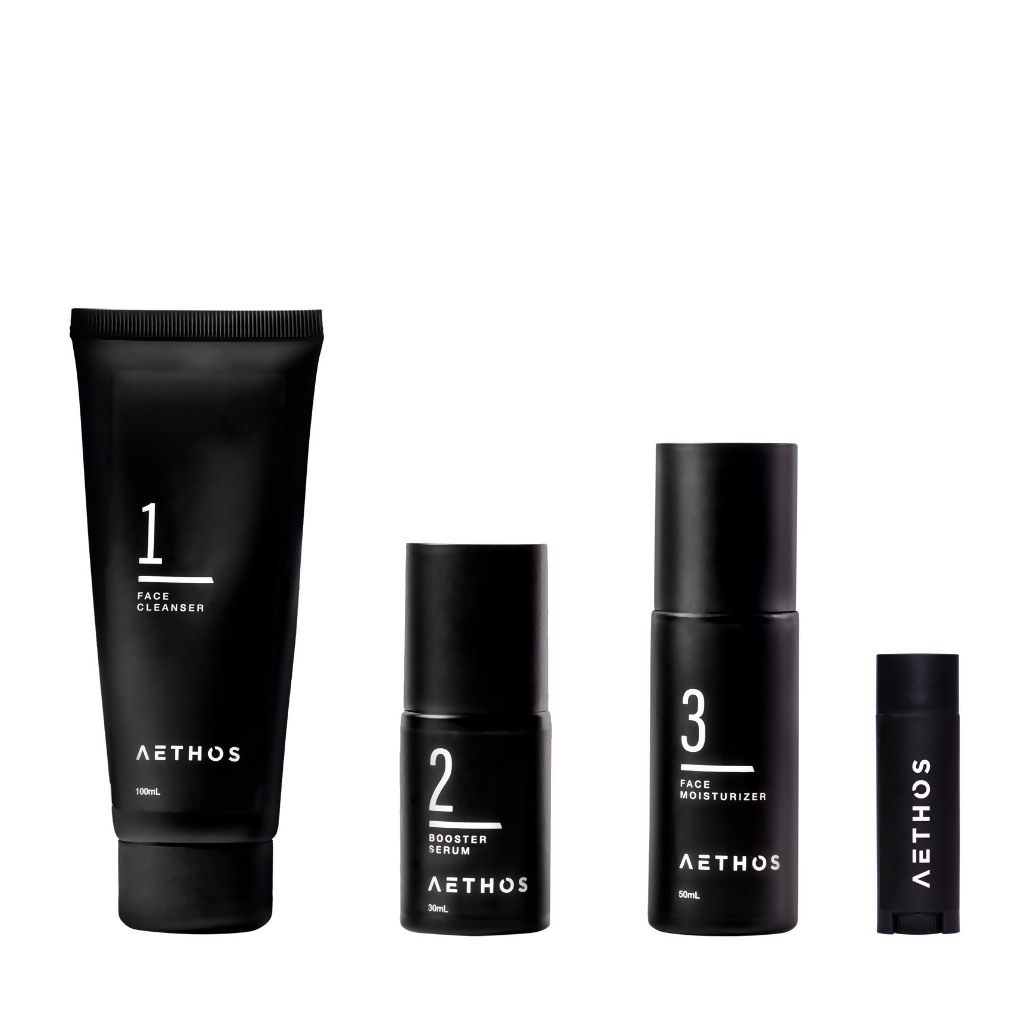 El Kit Esencial de Aethos es la forma más rápida y efectiva de mantener tu piel impecable en solo tres pasos y dos minutos. Incluye un cleanser refrescante que limpia sin resecar, un serum avanzado que hidrata, fortalece y revitaliza, y una crema facial multifunción que mejora la firmeza y deja un acabado mate y confortable. Además, el bálsamo labial ultra hidratante que recupera y protege los labios partidos sin dejar brillo, asegurando un cuidado completo de la piel y los labios sin complicaciones.
