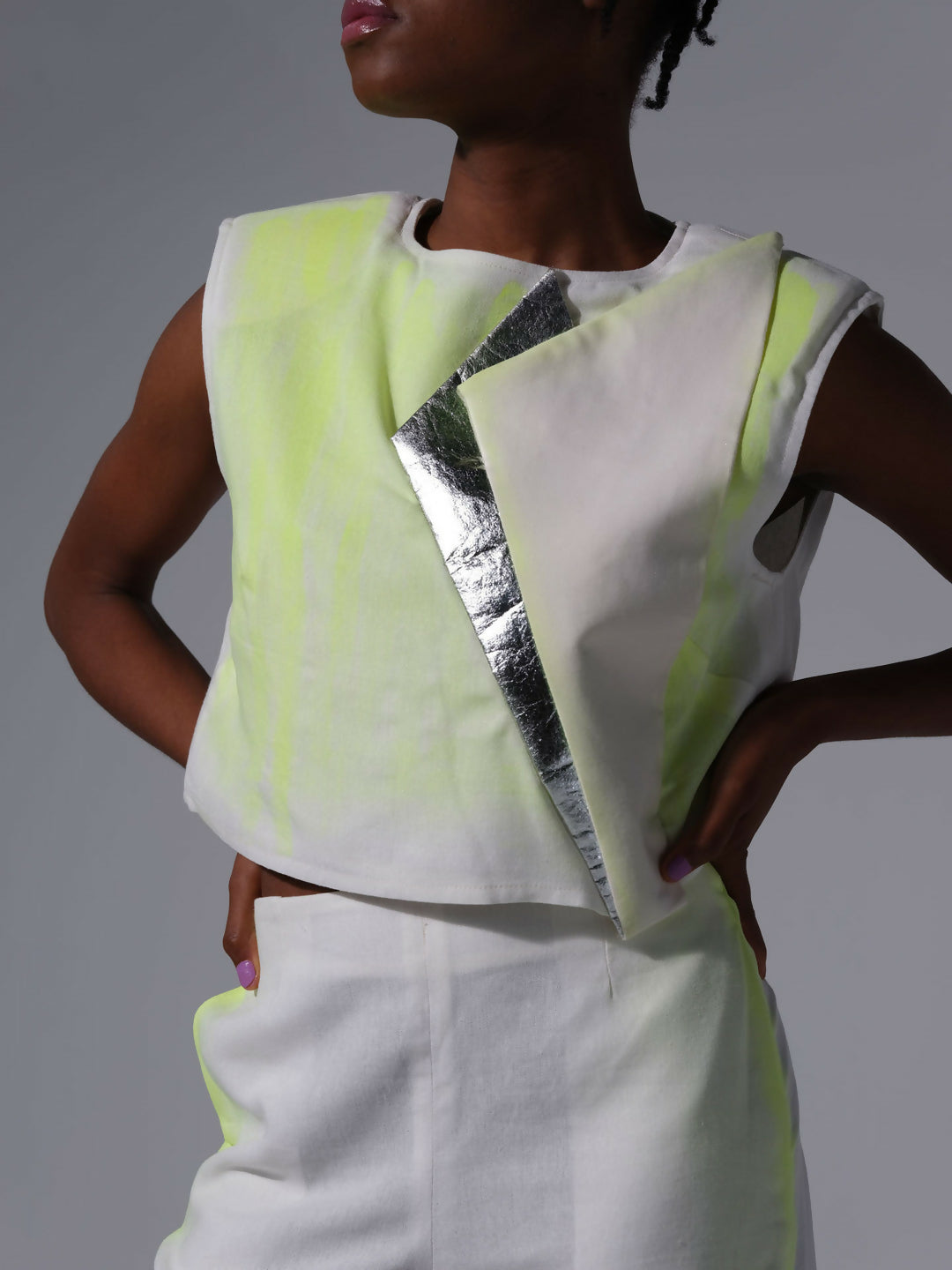 - Top corto sin mangas con detalles plateados.