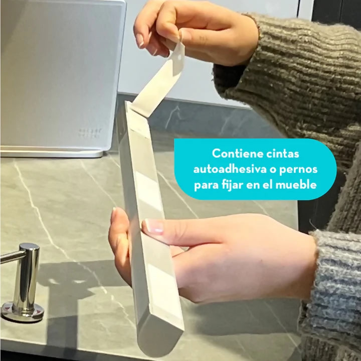 Trae una cinta autoadhesiva para pegarla al mueble y también tornillos por si necesitas una fijación más duradera, la batería se saca fácilmente para recargar.
