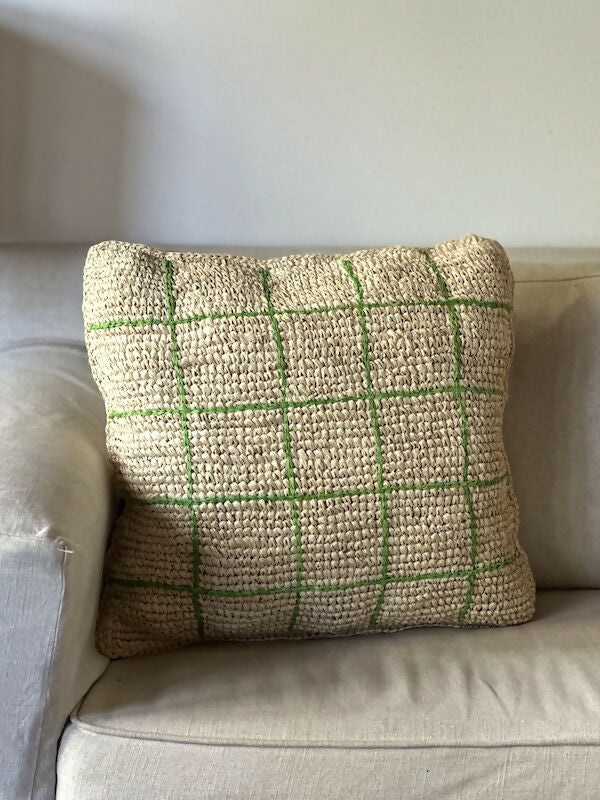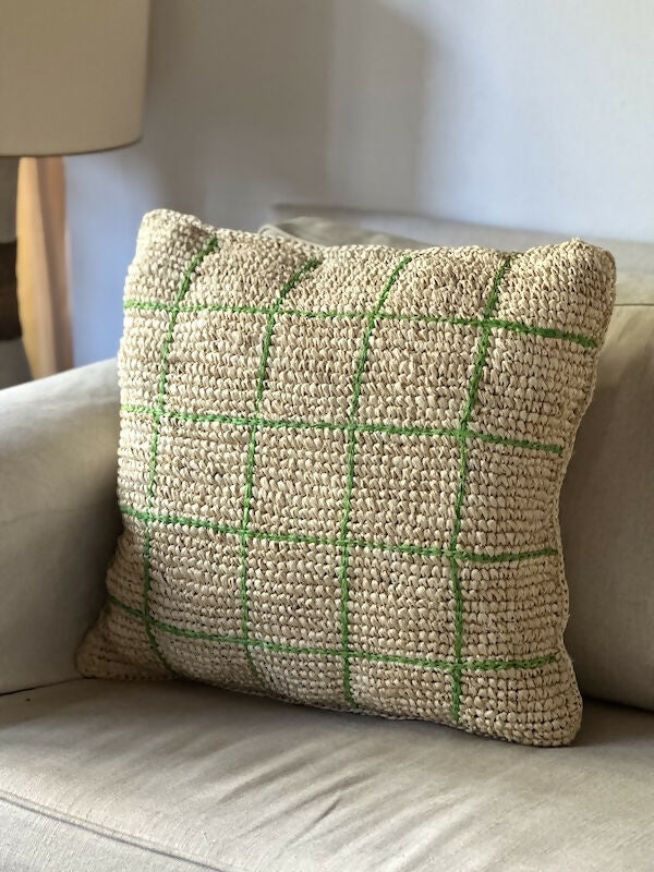 Añade un toque de estilo natural y artesanal a tu hogar con nuestro exclusivo Cojín Raffia Líneas Verdes. Su diseño único y textura cautivadora lo convierten en el complemento perfecto para cualquier espacio, desde el living hasta el dormitorio.