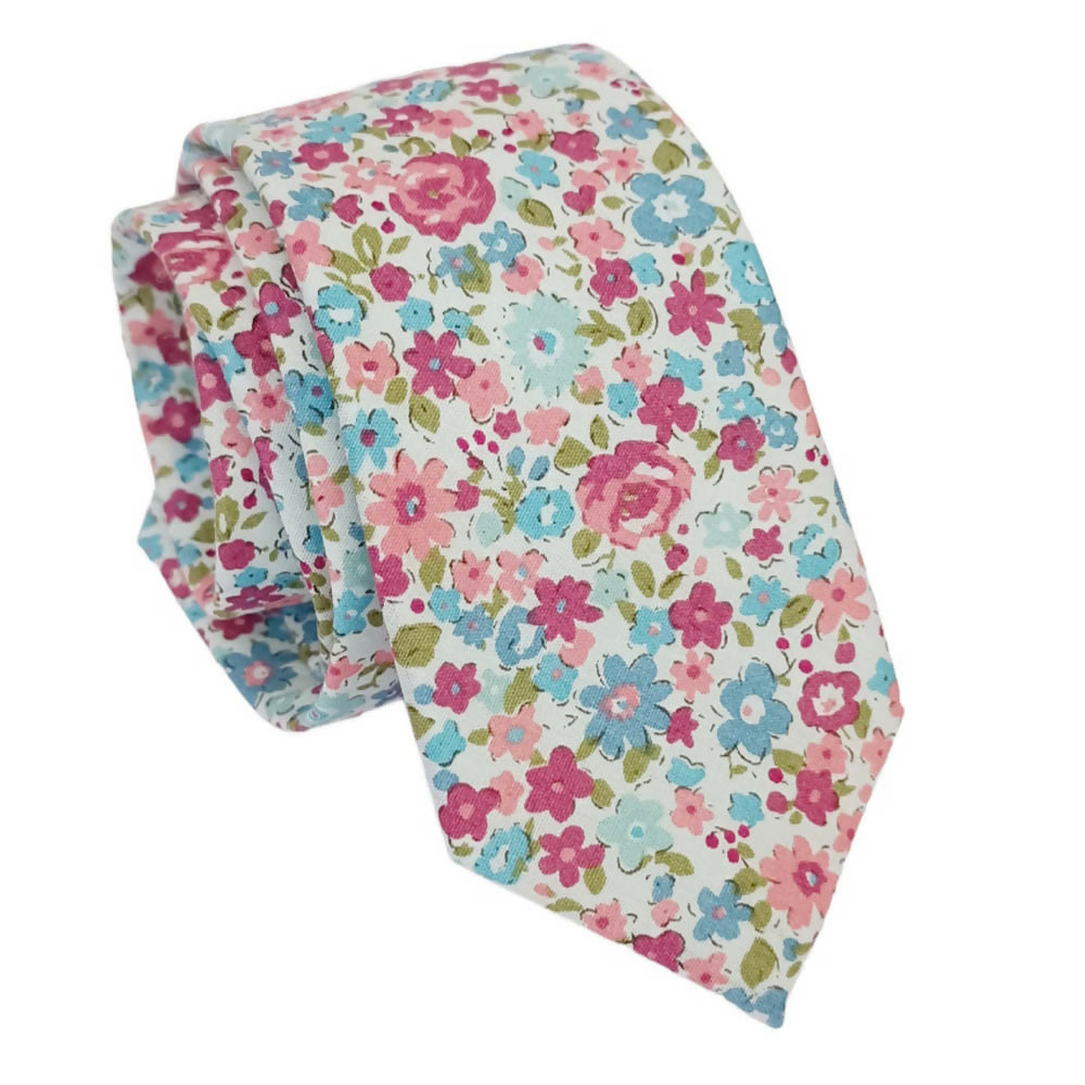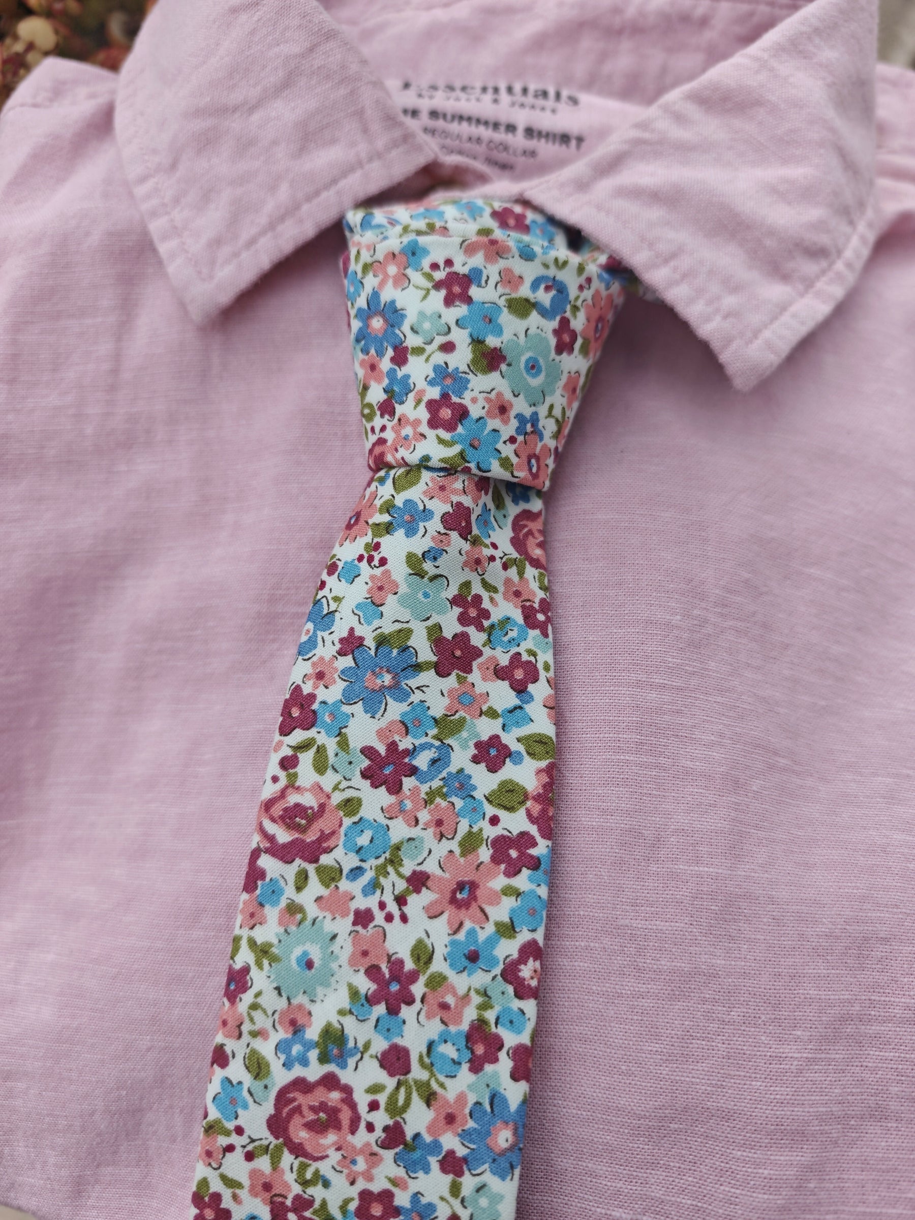 Corbata hombre 100% algodón estampada flores celeste rosadas y celestesAncho delgado 6 cm