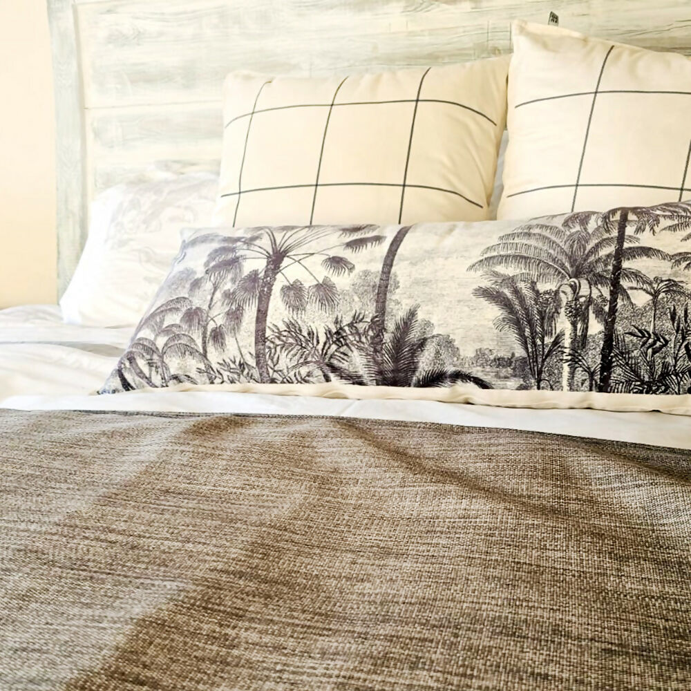 Cojín Landscape en velvet crudo, 100 x 40 cm. estampado.