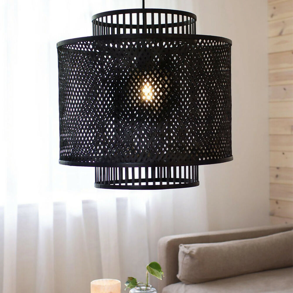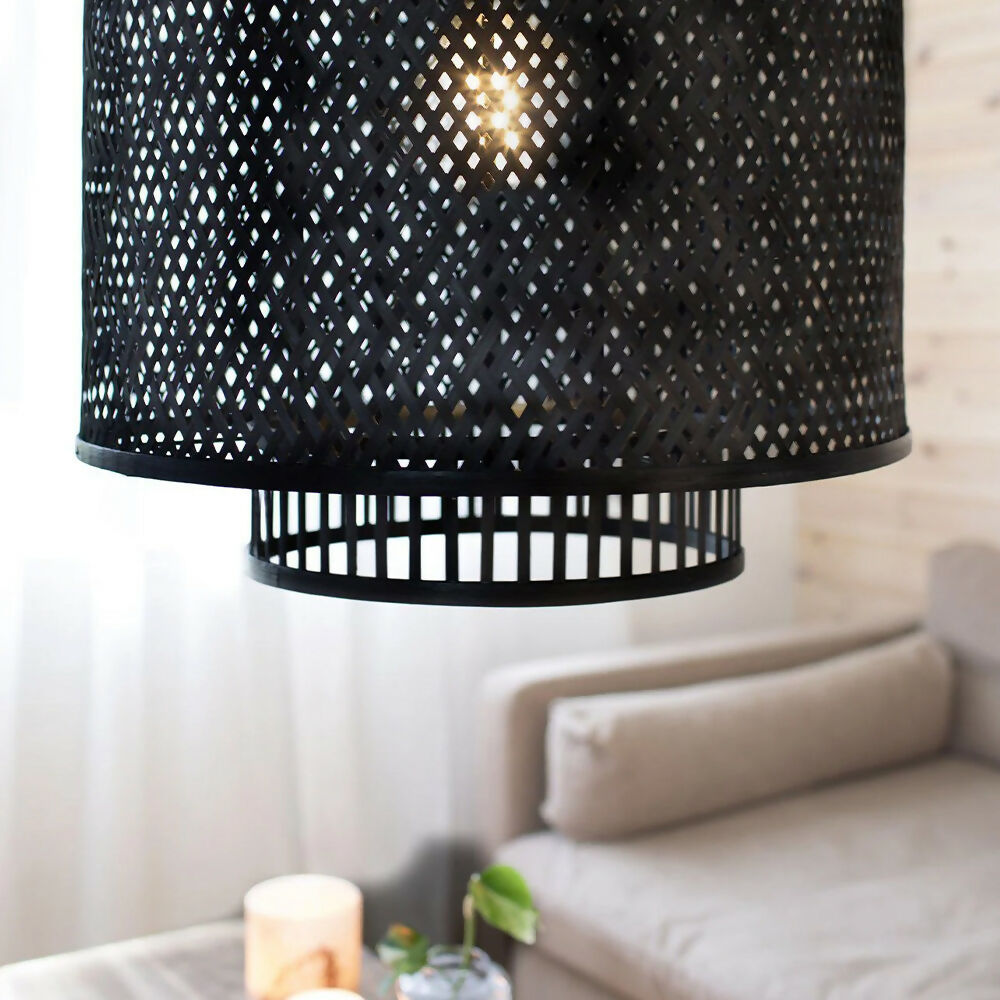 Lámpara de colgar, con forma de cilindro, tejida a mano en bambú de color negro mate