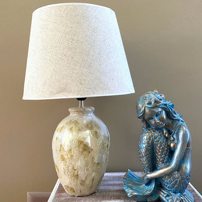 Lámpara base cerámica con pantalla beige. De diseño forma ovalada y color beige en cerámica con manchas color doradas.  Un elemento decorativo de iluminación de simple diseño que puede ser utilizado en áreas comunes y/o un velador de dormitorio. Dimensión 50 cm de alto.