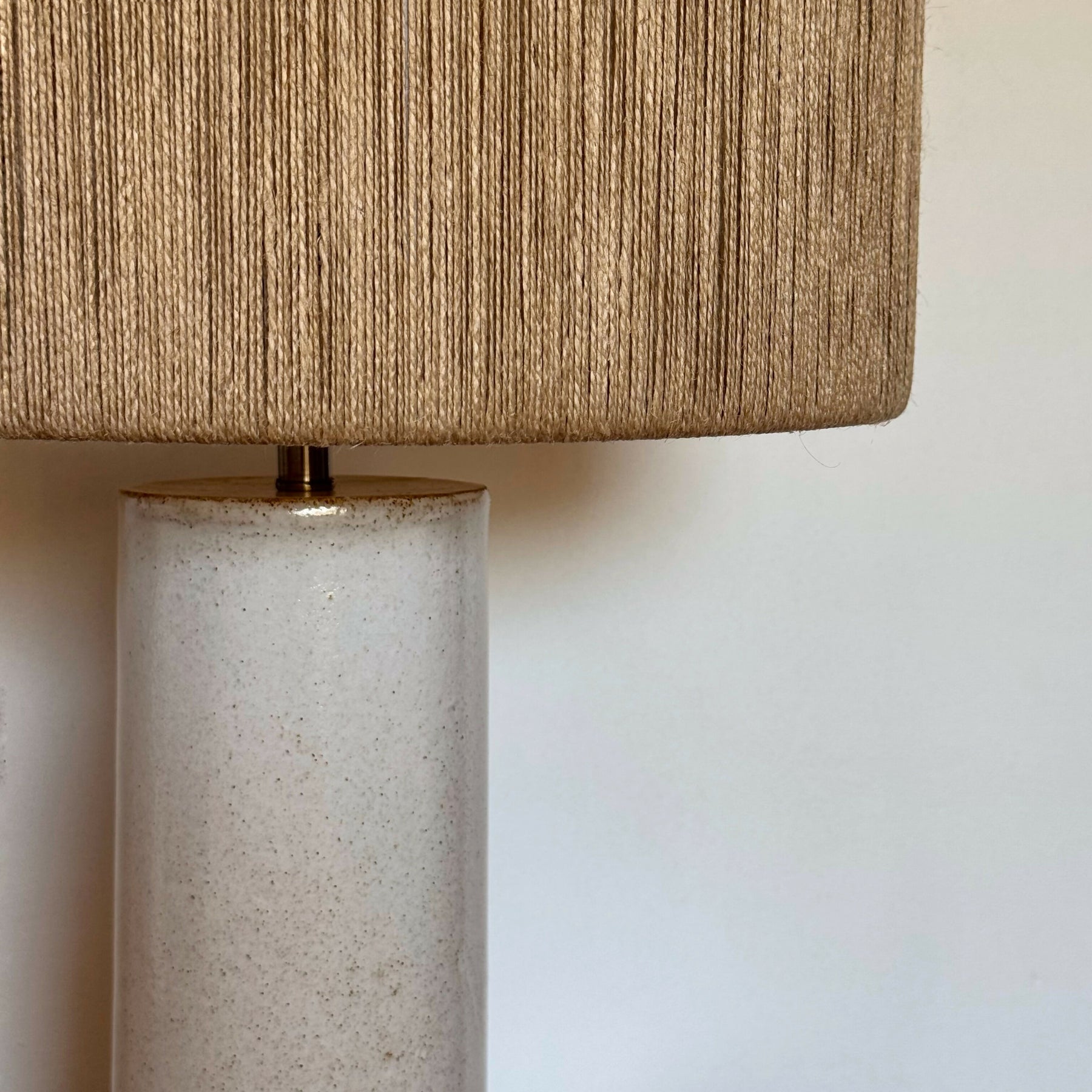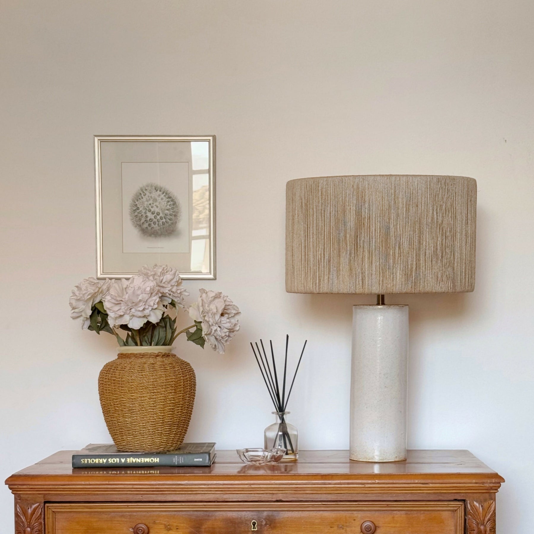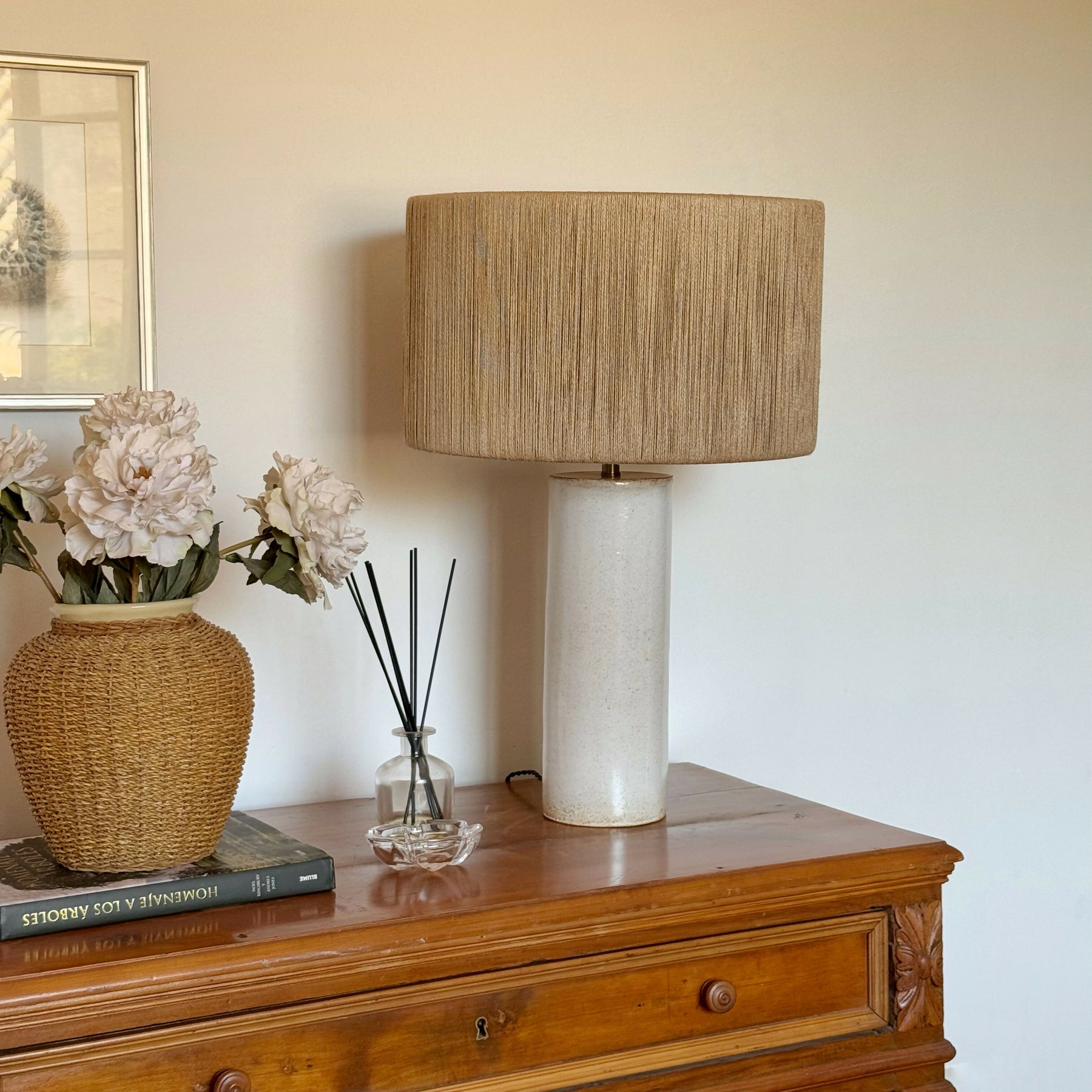 Lámpara de mesa en tono blanco con pantalla de yute. Logra un estilo sofisticado y elegante al combinar nuestra base de cerámica gres con una pantalla de yute en tono natural. Perfecta para recibidores y como luz de apoyo en tu living o comedor.