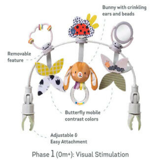 | Dos etapas de desarrollo: el arco está diseñado para adaptarse a dos etapas de desarrollo diferentes. Para los recién nacidos, presenta mariposas colgantes ilustradas en blanco y negro y coloridas para estimular los sentidos visuales. Para bebés de 3 meses en adelante, incluye un laberinto de cuentas de traqueteo y un espejo giratorio de doble cara con imágenes animadas, perfecto para desarrollar habilidades motoras finas. Habilidades motoras y coordinación ojo-mano: colocando el arco de actividad a la distancia y ángulo adecuados, anima a tu pequeño a participar con los juguetes. A medida que crecen, aprenderán a tirar, tocar y jugar con los juguetes, fomentando el desarrollo de sus habilidades motoras y la coordinación ojo-mano. Elementos estimulantes: el arco está equipado con elementos estimulantes visuales que ayudan a promover los sentidos del bebé. Esto ayuda en el desarrollo de las habilidades motoras y mantiene a su bebé entretenido. Muchos juguetes colgantes activados por bebés diferentes unidos en el arco, ofrecen diversión y compromiso mientras aumentan múltiples habilidades de desarrollo mientras paseas con tu bebé, incluyendo móvil de mariposa con color de contraste, conejo con orejas y cuentas arrugadas, espejo giratorio animado con actividad de impresión, etc. |