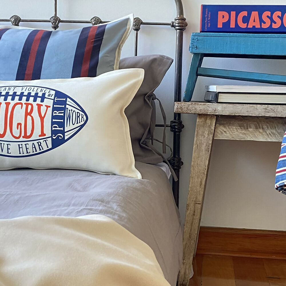 Funda de cojín en linet crudo estampado, desmontable con cierre, se lava fácilmente a máquina.