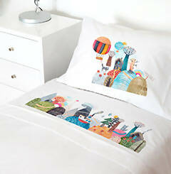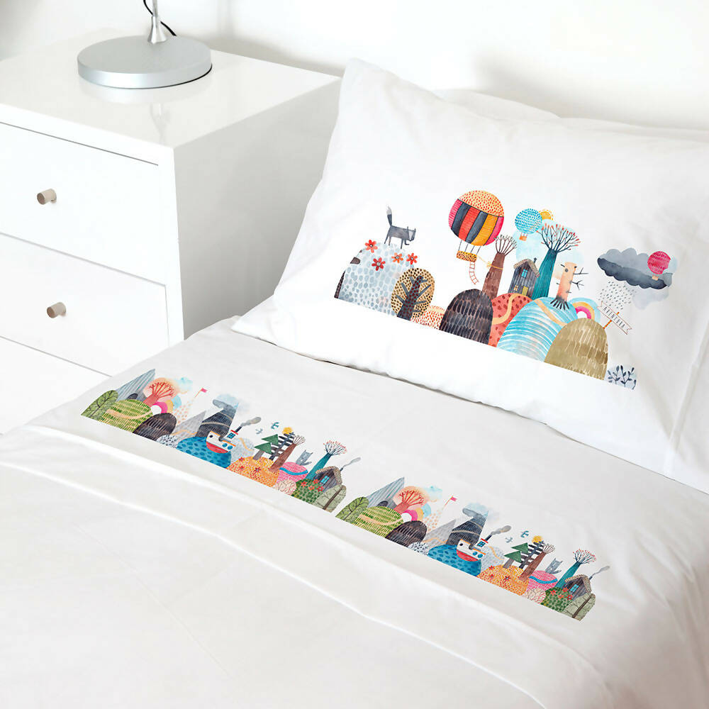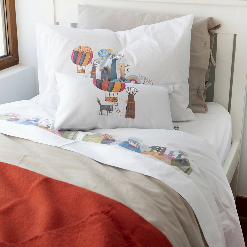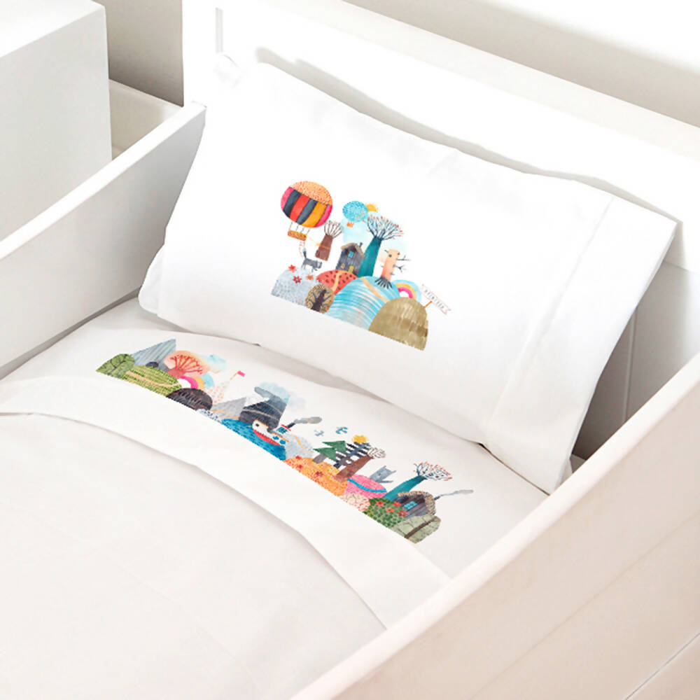 1 plaza: Sábana bajera elásticada 90 x 200 x 30 cm., encimera 160 x 270 cm. y 1 funda de almohada 50 x 70 cm.