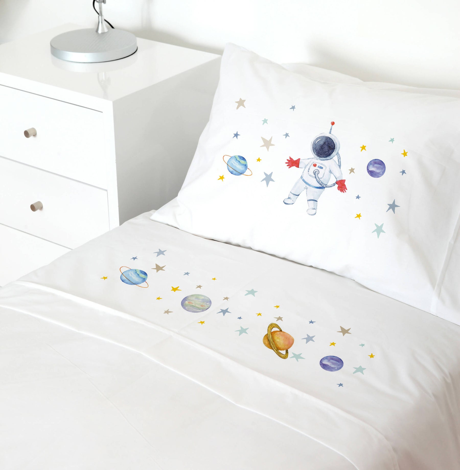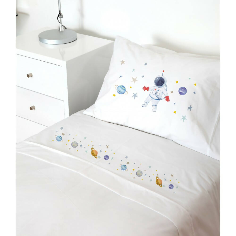 1 plaza: Sábana bajera elásticada 90 x 200 x 30 cm., encimera 160 x 270 cm. y 1 funda de almohada 50 x 70 cm.