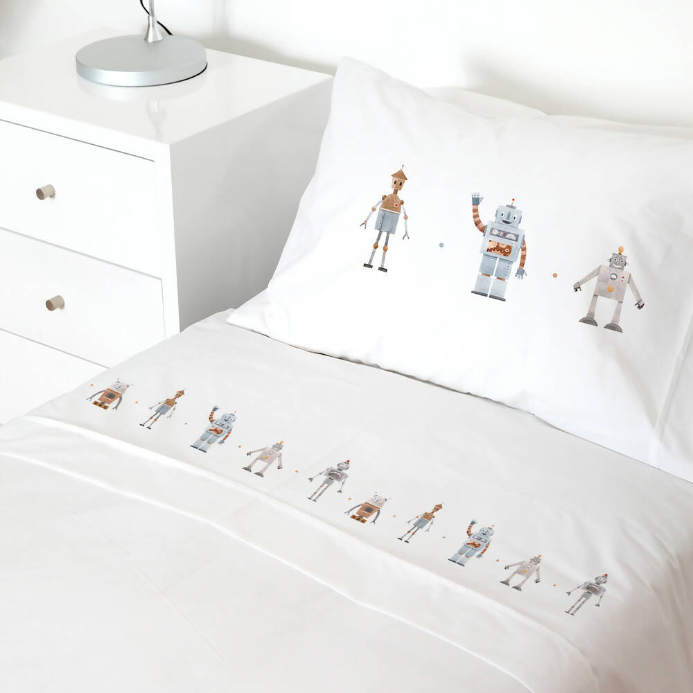 Juego de Sábanas Robot 100% Algodón 200 hilos MEDIDAS COLCHÓN: Colecho 80 x 50 cm. Incluye bajera elasticada 50x80x15 cm., encimera 90×110 cm. y funda de almohada de 40 x 25 cm. Cuna 140 x 70 cm. Incluye bajera elasticada 70x140x15 cm., encimera 120×160 cm., y funda de almohada de 50 x 30 cm. Pack & Play 100 x 70 cm. Incluye bajera elasticada 70x100x15 cm., encimera 115×120 cm., y funda de almohada de 50 x 30 cm. Transición 150 x 70 cm. Incluye bajera elasticada 70x150x15 cm., encimera 120×180 cm. y funda de almohada de 50 x 30 cm.