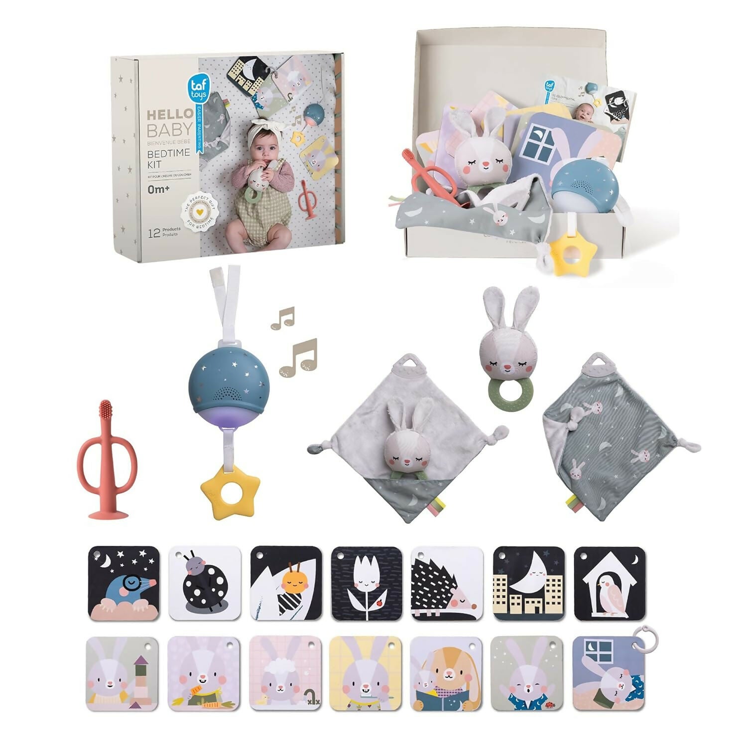 | Una caja con todo lo esencial para acompañar al bebé a la hora de dormir. 12 actividades para tranquilizar al bebé hasta que se duerma: 7 imágenes de doble cara (una en color y otra en blanco y negro) que cuentan una historia, una lamparilla músical, un peluche plano con un mordedor conejo, un cepillo de dientes para bebé… Las tarjetas con imágenes permiten estimular la vista del bebé. Se pueden colocar las tarjetas sobre el anillo para crear un llavero. El juguete músical reproduce 20 minutos de músicas suaves y relajantes. El juguete también emite luz para crear un ambiente tranquilo y relajante que prepare al bebé para dormir. Se puede utilizar desde el nacimiento |