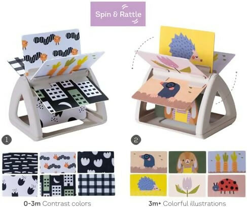 | Un libro giratorio de doble cara para bebés sobre 3 etapas de desarrollo con ilustraciones en blanco y negro y coloridas. Cree un sonido de cascabel al hacer girar las páginas del libro que enseñan sobre causa y efecto y fomenta el tiempo boca abajo. Estimula los sentidos del bebé y el desarrollo de la vista. |