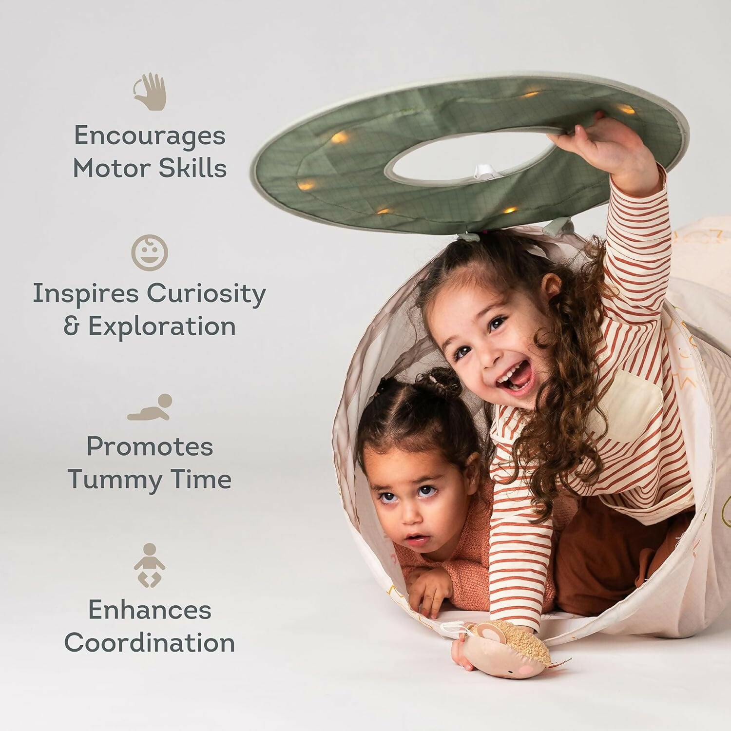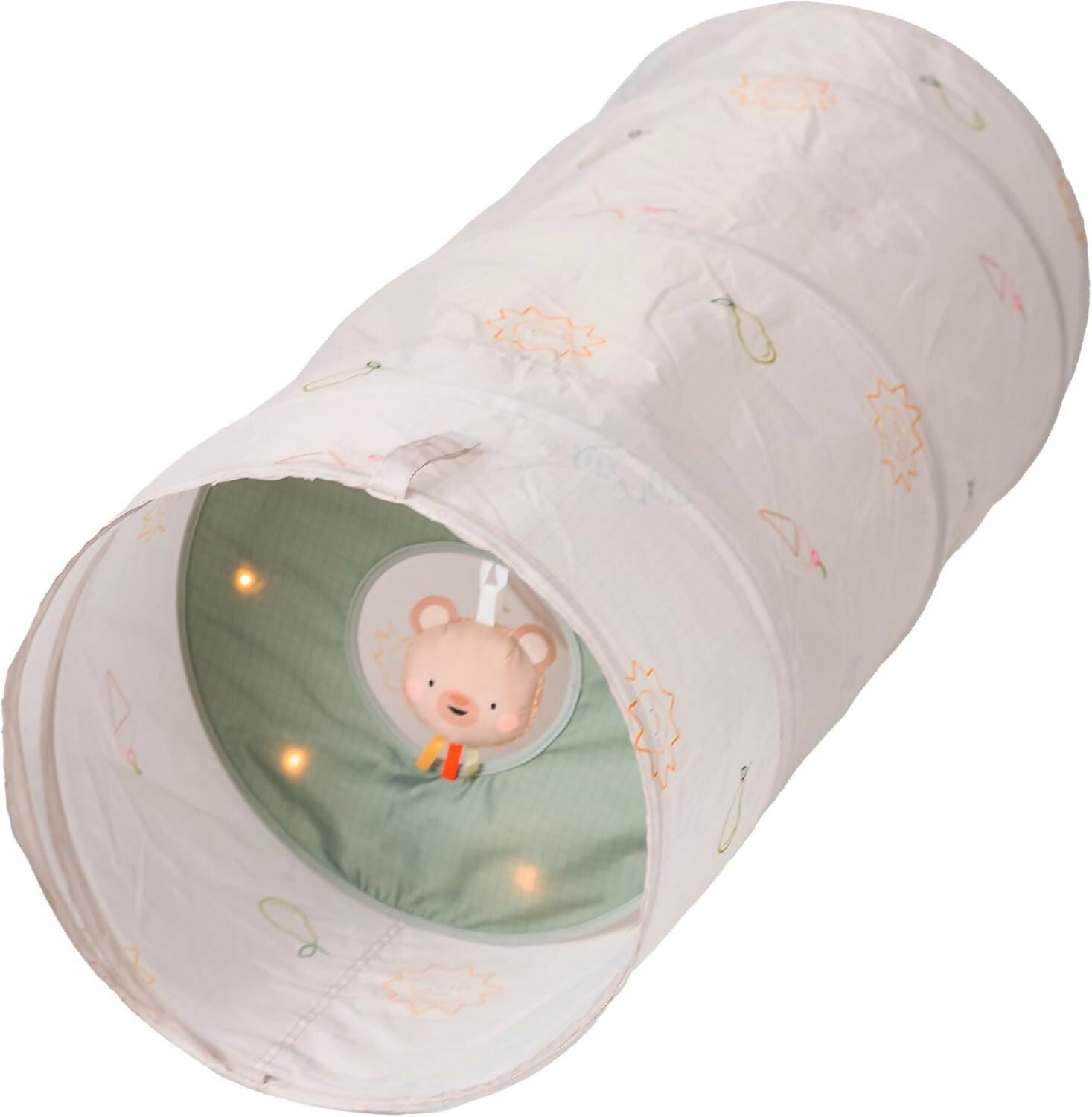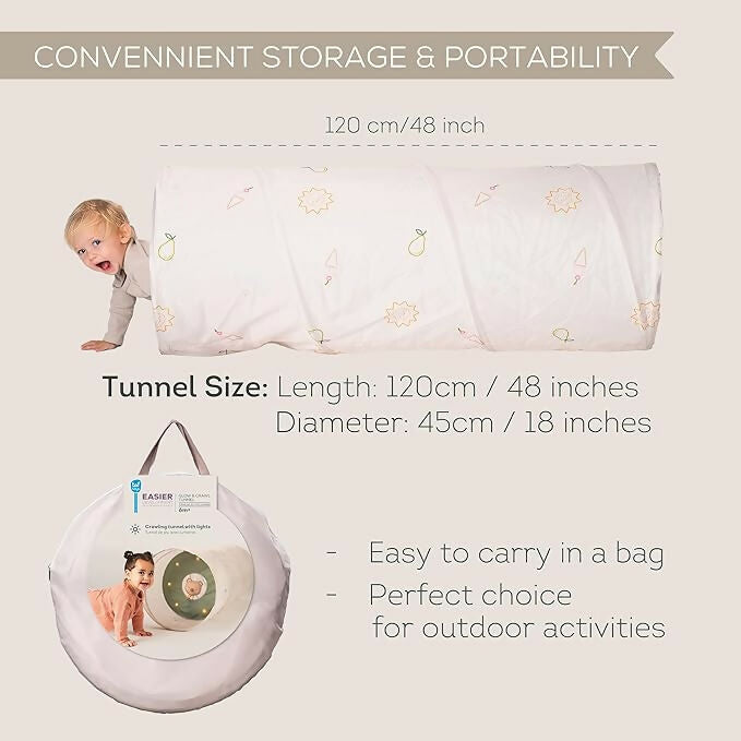| Diseñado para cautivar a los bebés curiosos, este túnel Glow & Go de 120 cm activa múltiples sentidos. El acogedor espacio cubierto cuenta con luces parpadeantes y relajantes que atraen a los niños pequeños para fomentar la exploración y el gateo. Se incluye un osito de peluche suave con cintas y una campana que agrega juego táctil, invitando a las manitas a alcanzar y agarrar. Con dos modos de luz, el túnel despierta la imaginación y favorece el desarrollo motor temprano a través del descubrimiento lúdico. El modo de luz se reproduce durante 10 minutos. |