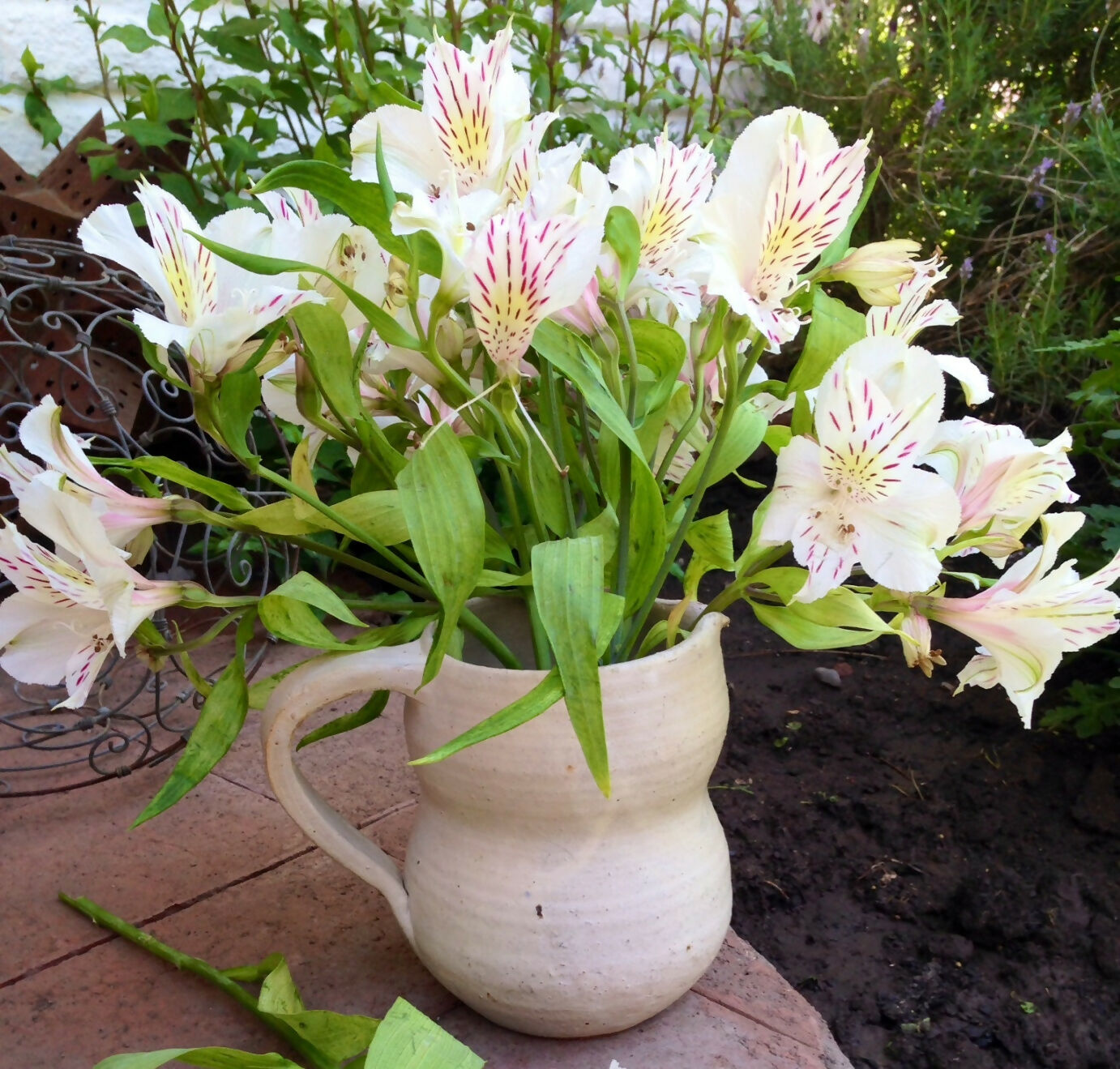 Jarra de cerámica gres mediana con diseño de líneas orgánicas. Completamente hecha a mano, su terminación gruesa y lo satinado de su esmalte color marfil la hace una pieza muy decorativa, aunque puede usarse para poner unas lindas flores o como entretenida jarra para un jugo o pisco sour.