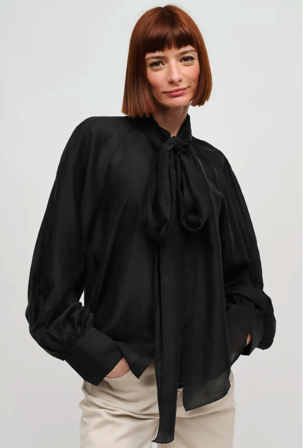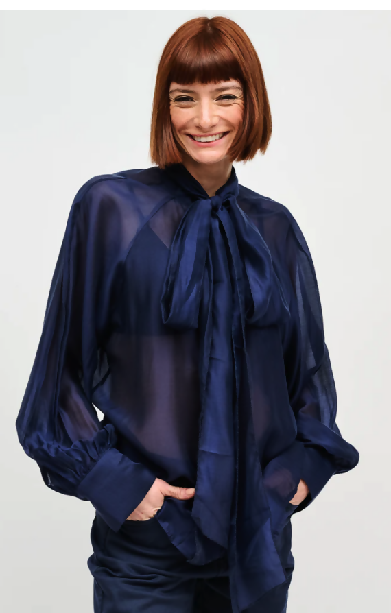 Blusa de viscosa italiana semitransparente, abotonada y cuello con lazos para hacer nudo. Manga globo.