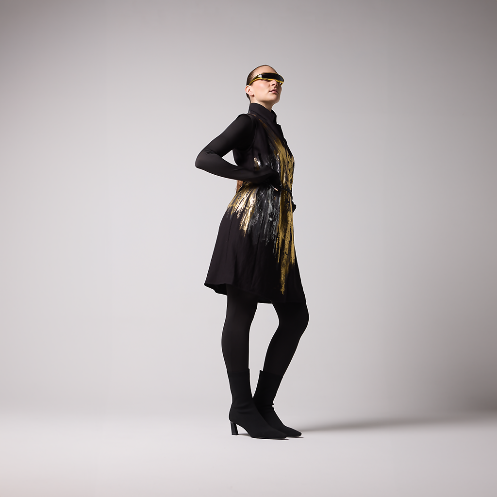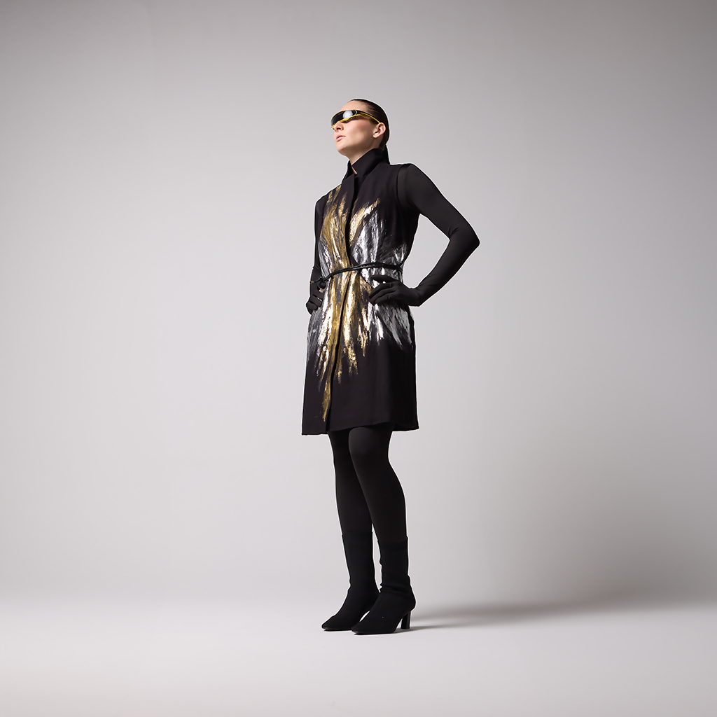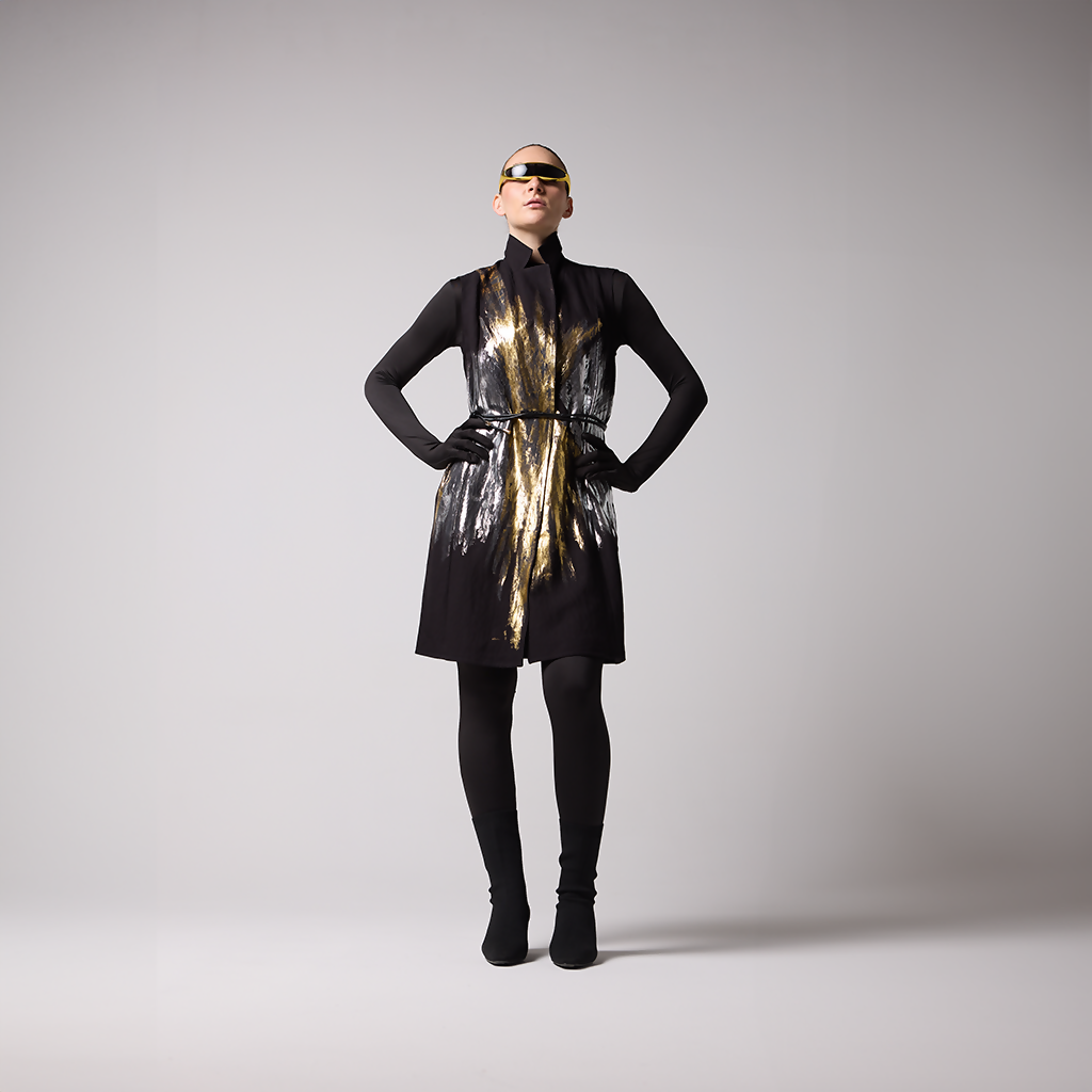 El blazer Earendel Dorado-Plata de la línea Ready to Wear de LIVERTA está elaborado con poliéster y algodón reciclados, promoviendo el upcycling y la moda sostenible. Presenta una elegante estampación foil en dorado y plateado que realza su diseño exclusivo.