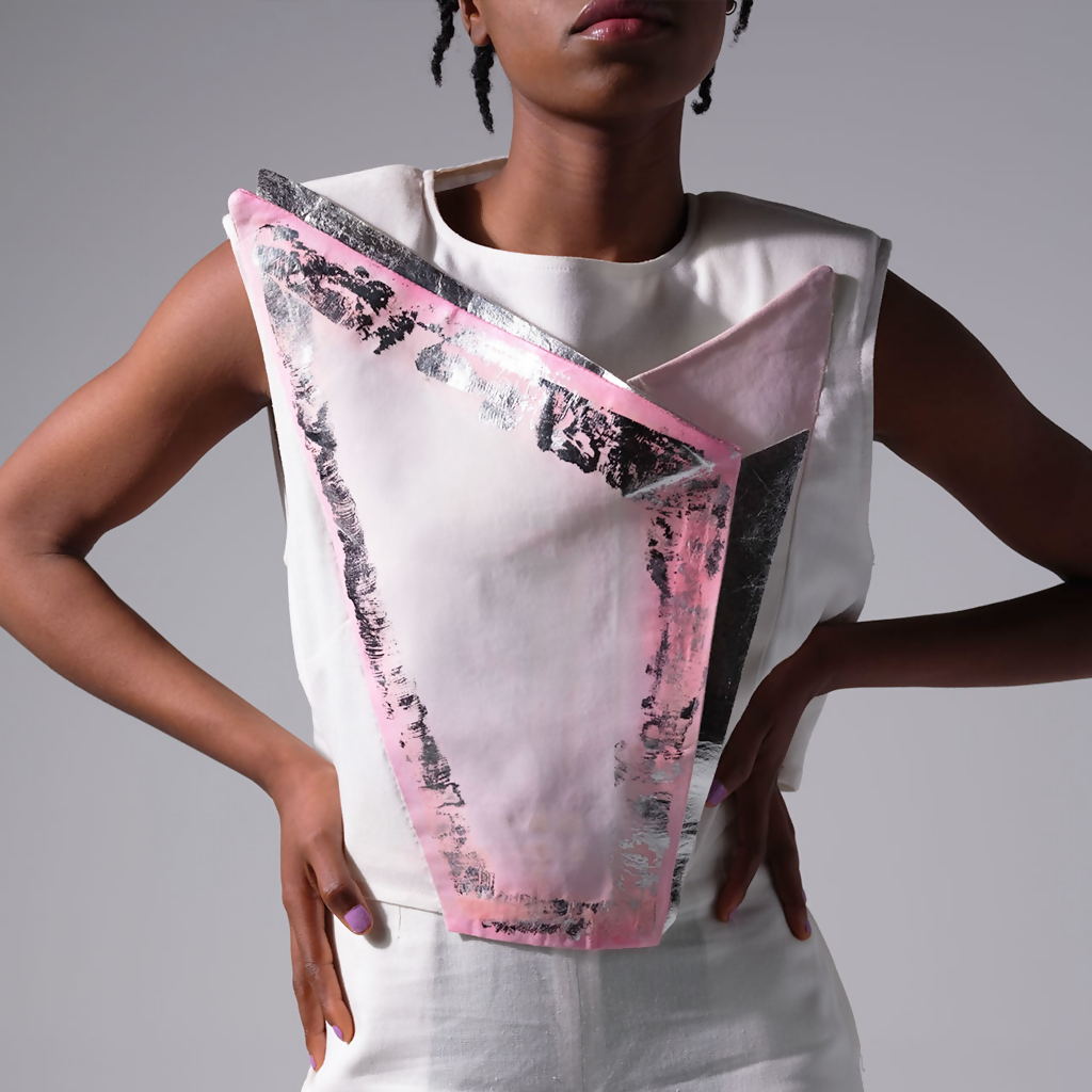 Top de lino peruano, construido con detalles geométricos en fibra de piña 100% sustentable, aplicación de foil plateado. Telas intervenidas con técnicas de teñido artesanal y aerógrafo. De la nueva colección diseño de autor - Ready to wear -primavera verano Astralis Waves 2025 - LIVERTA ® de la diseñadora nacional María Pía Cornejo.