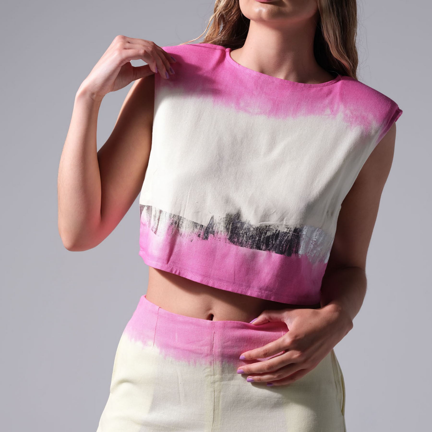 Top de lino peruano, construido con detalles en aplicación de foil plateado. Telas intervenidas con técnicas de teñido artesanal. De la nueva colección diseño de autor - Ready to wear - primavera verano Astralis Waves 2025 - LIVERTA ® de la diseñadora nacional María Pía Cornejo.