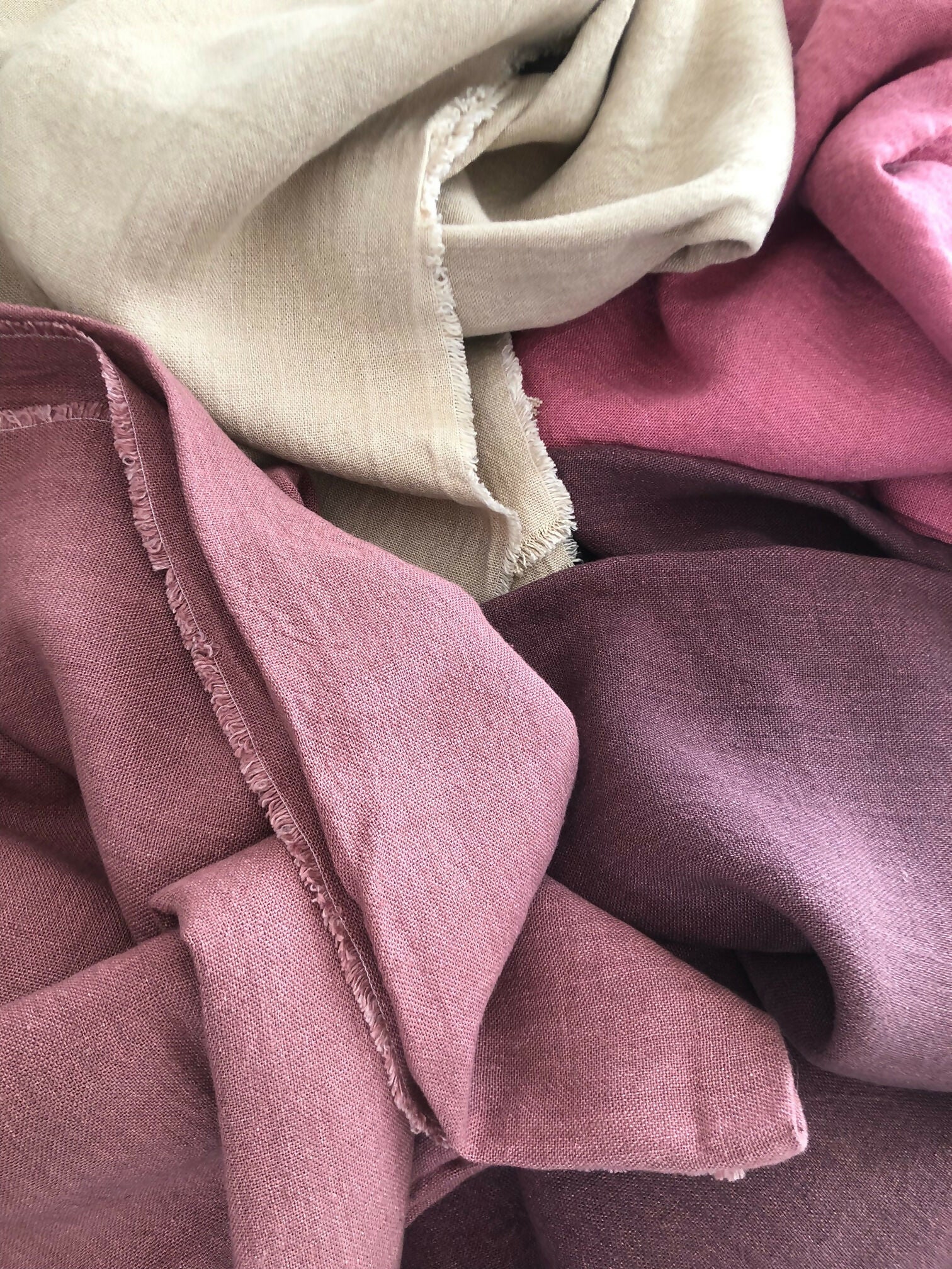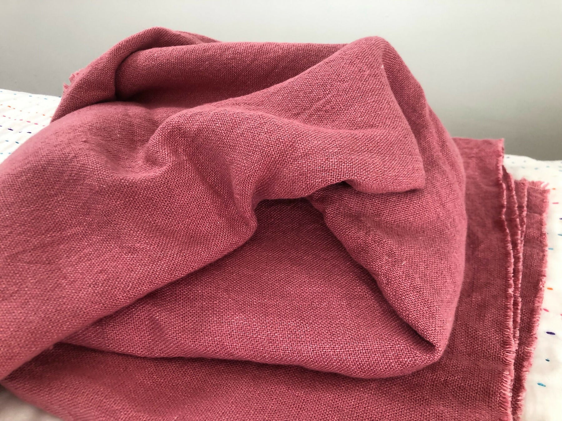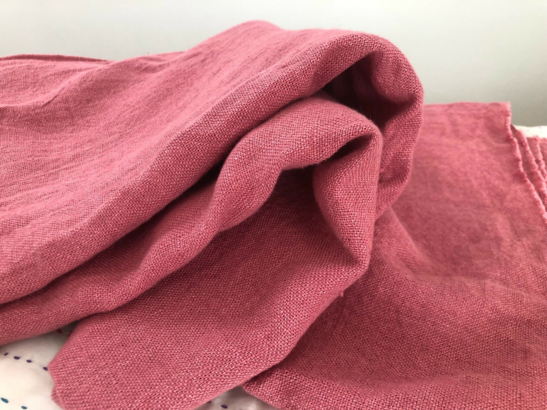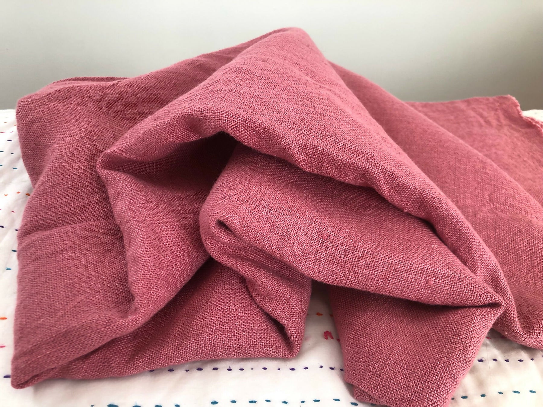 Gran manta o piecera de lino rústico 100% natural en un atractivo color rosa, tamaño king.