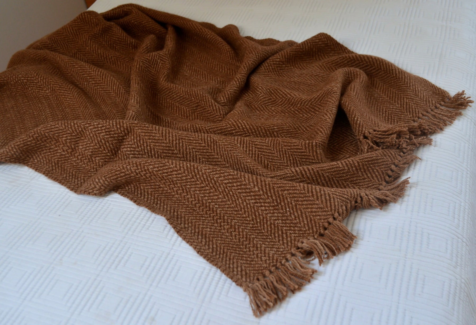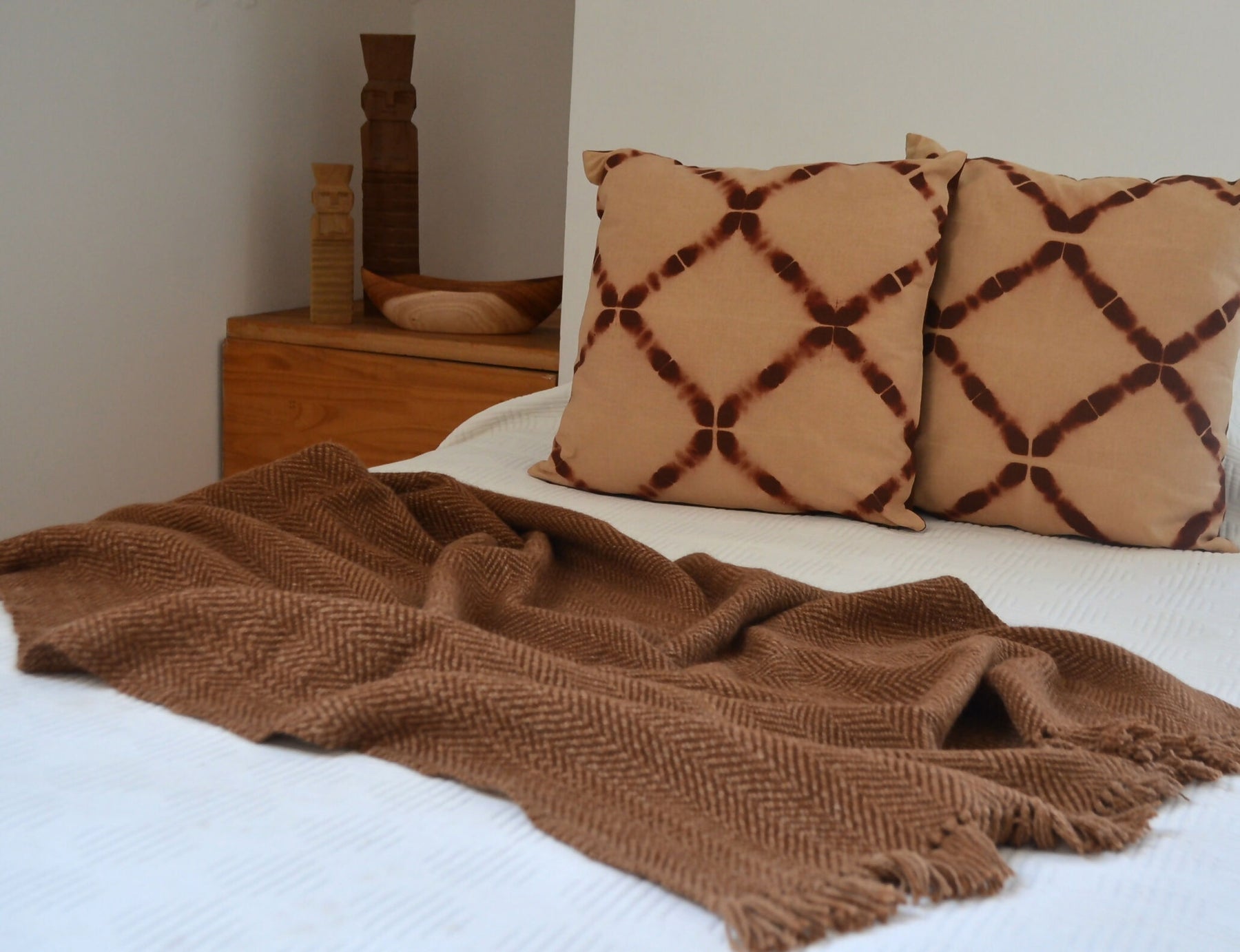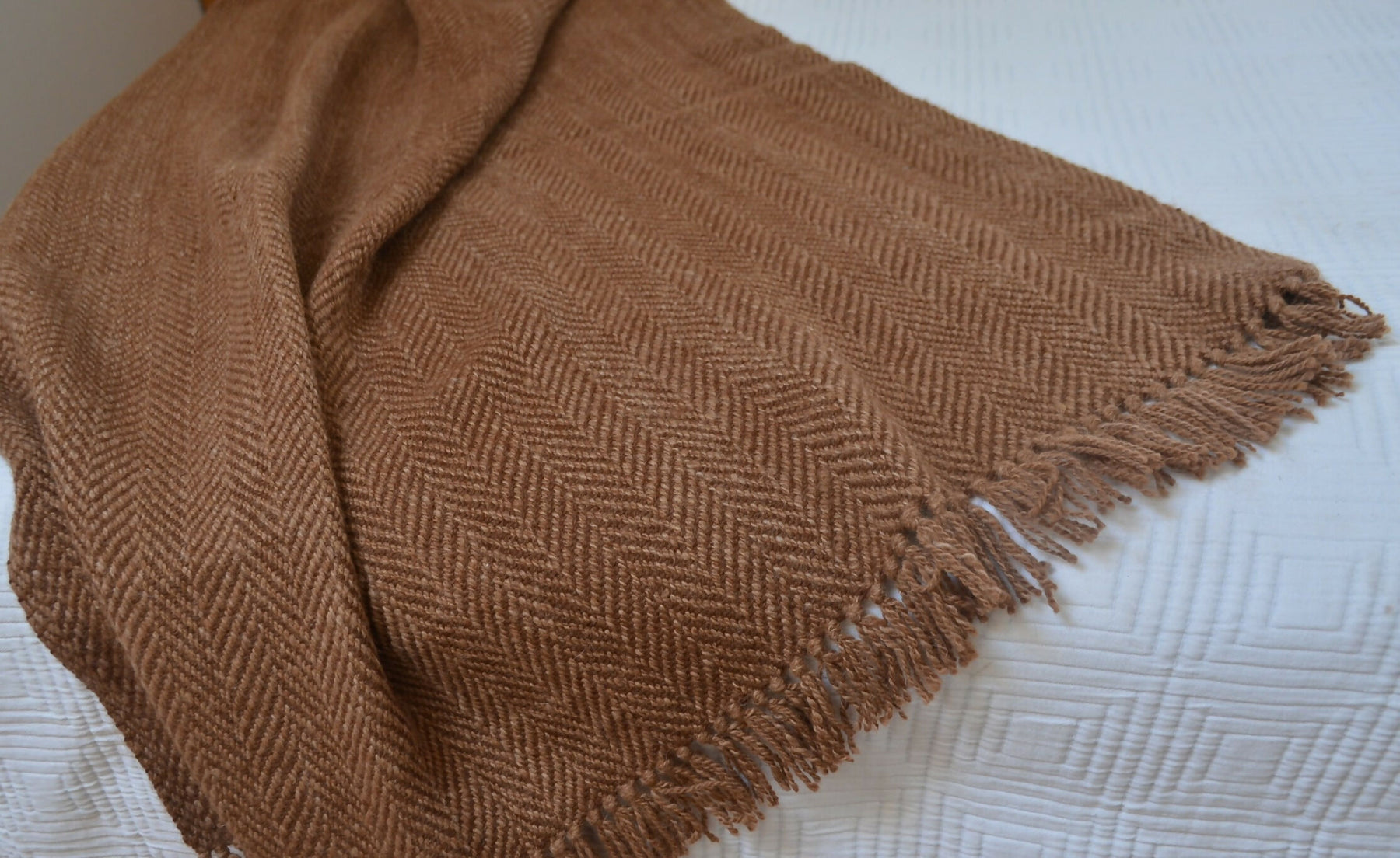 Gran piecera tejida a telar en exquisita fibra de alpaca 100% natural combinando colores beige y caramelo.