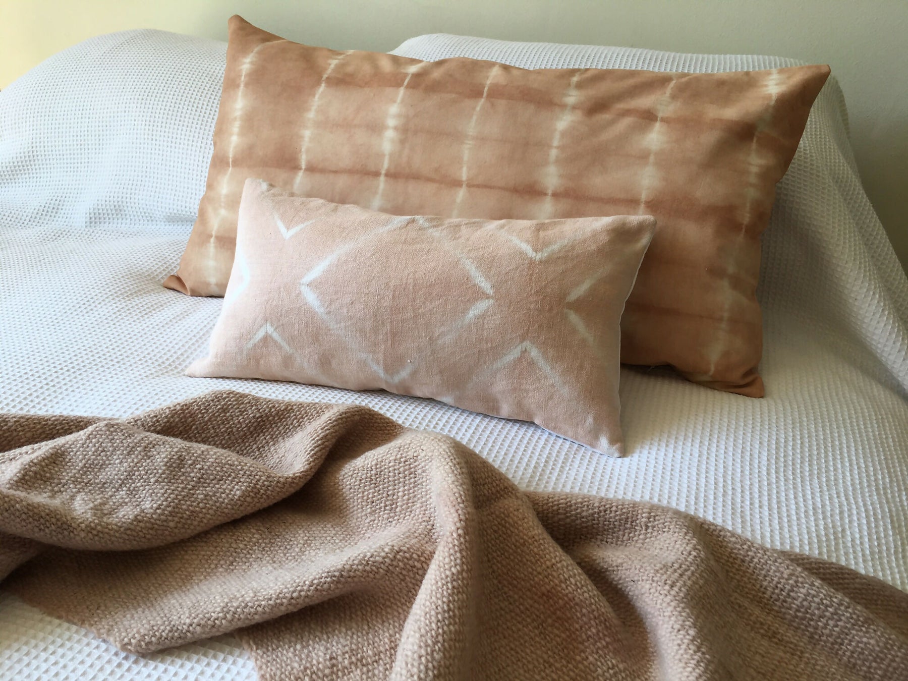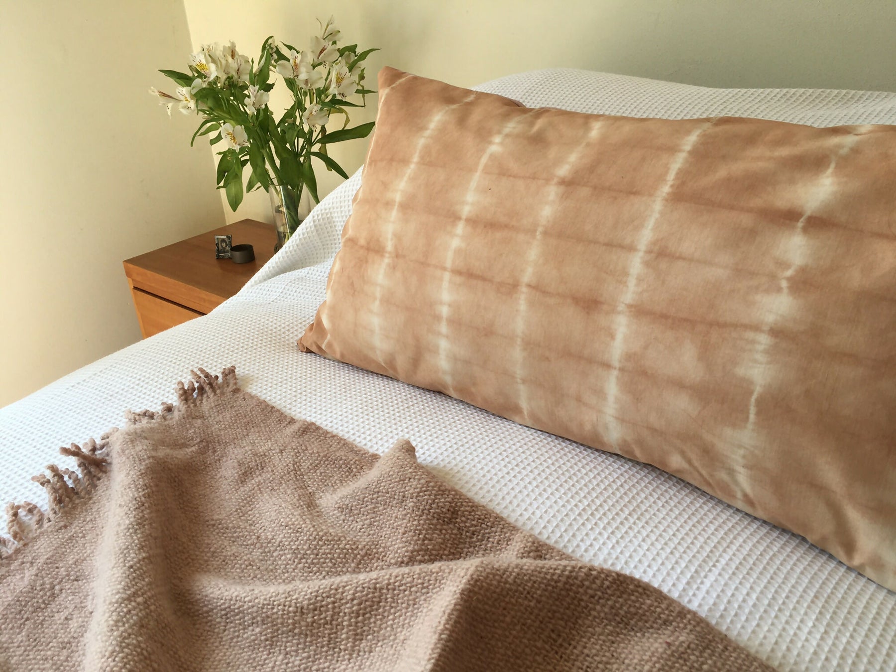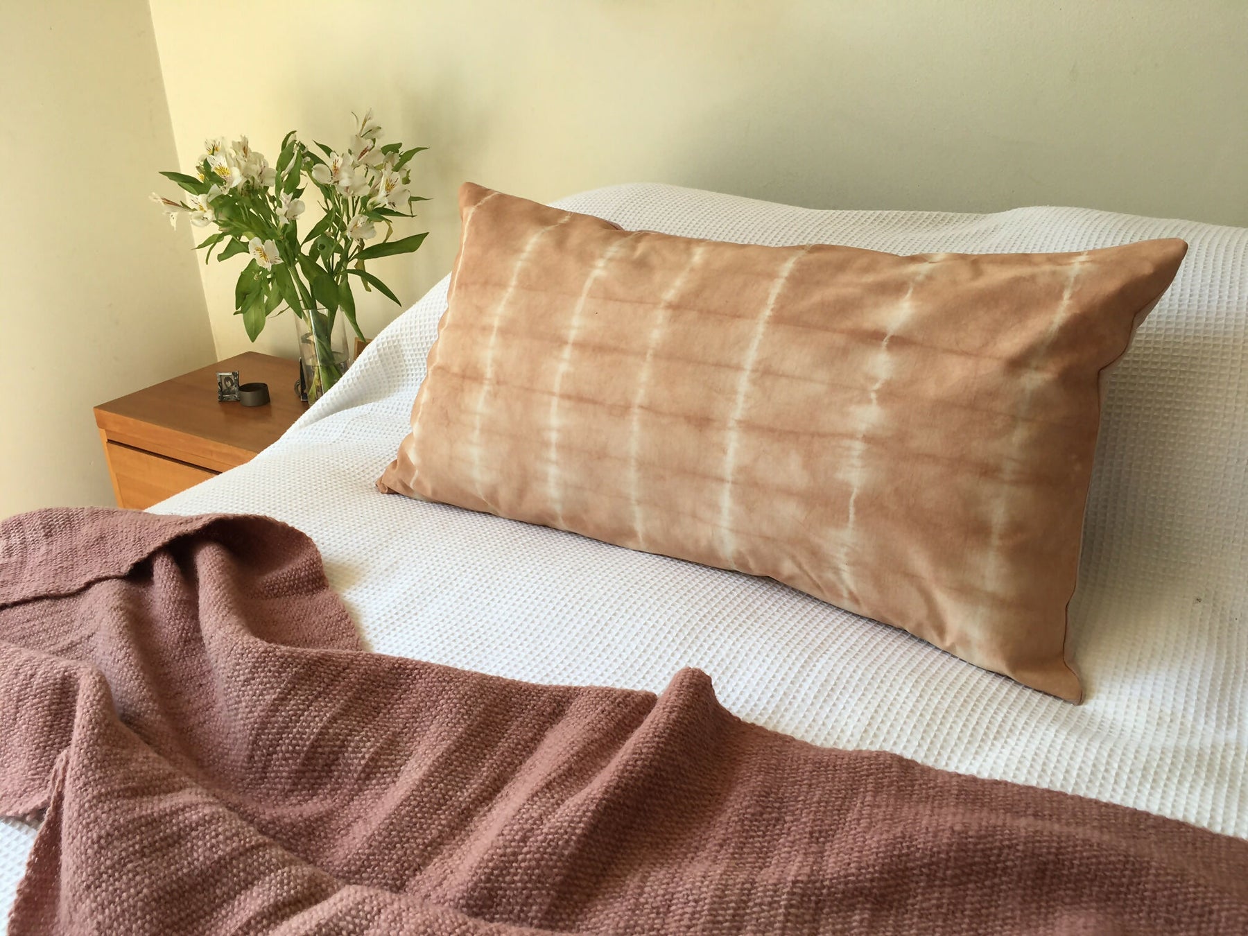 Delicado trabajo de amarras o técnica de Shibori para crear un diseño único e irrepetible teñido usando tintes naturales de plantas que aportan su pigmento y energía. Sin químicos adicionales.