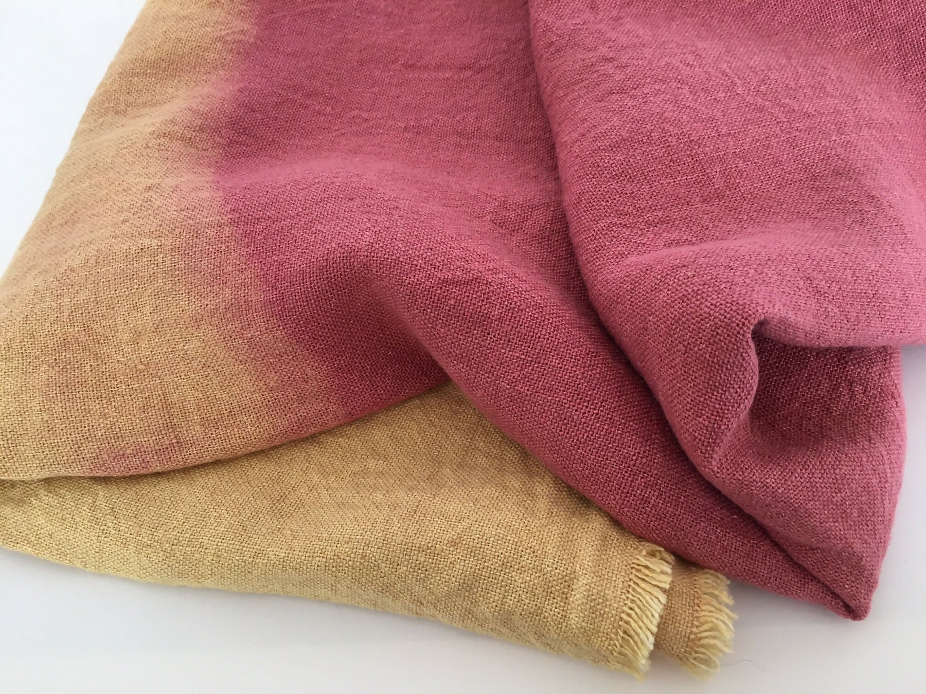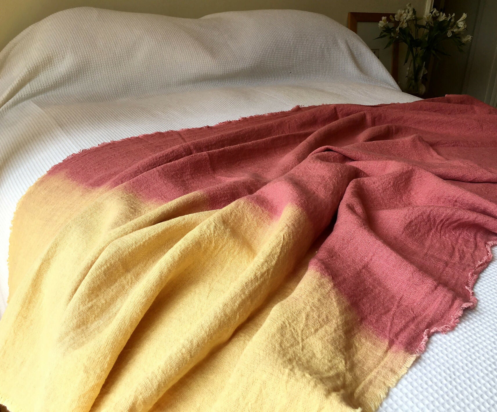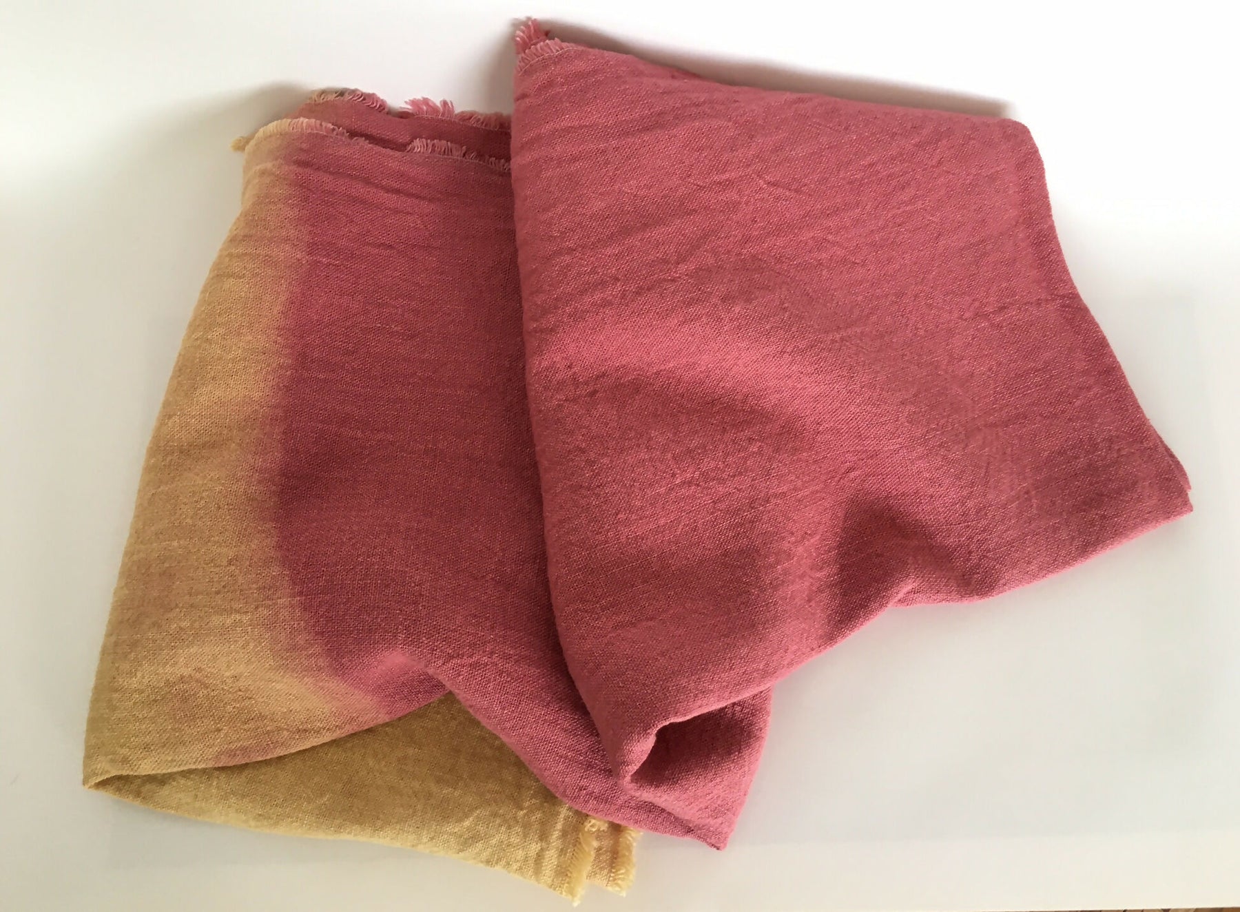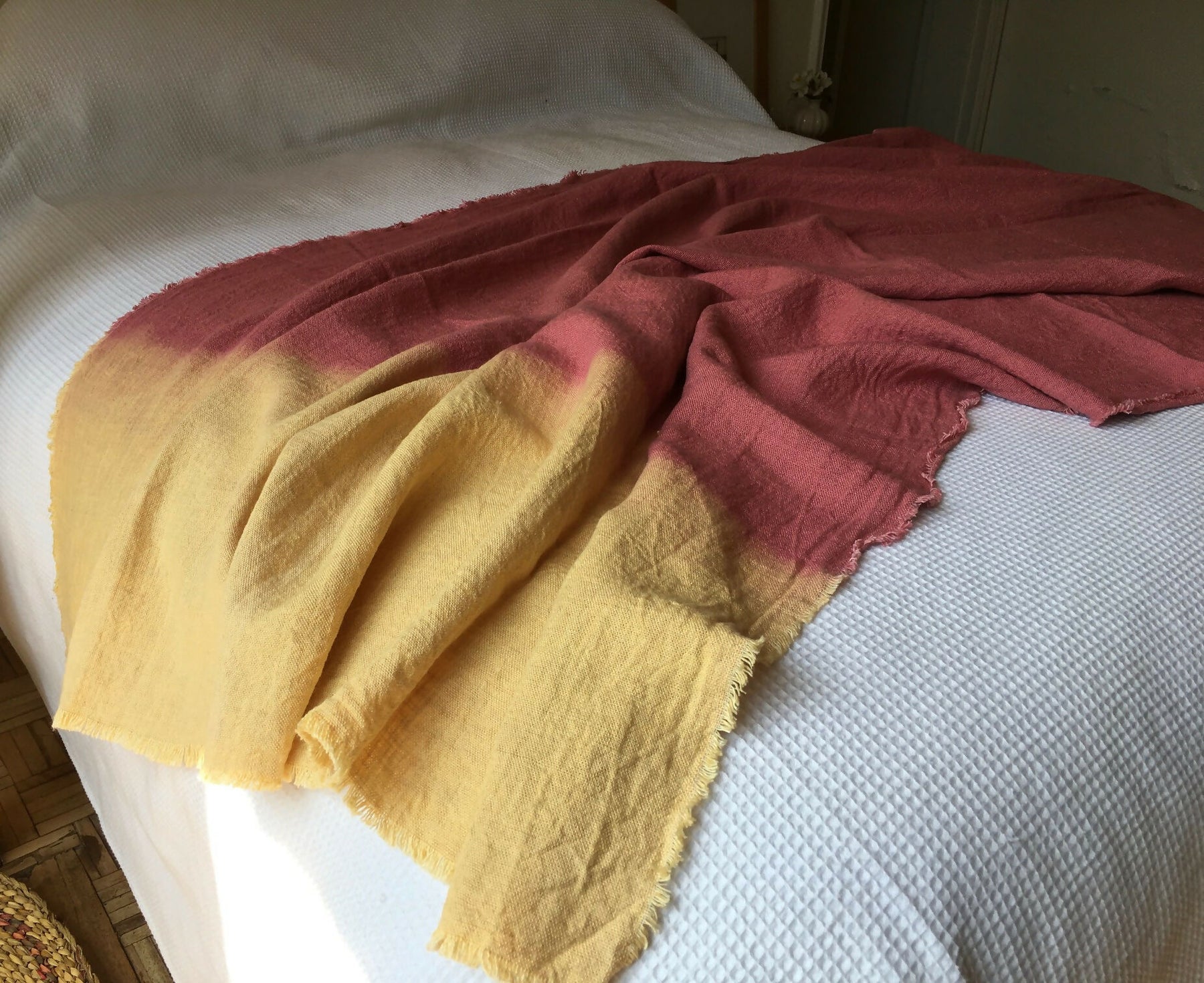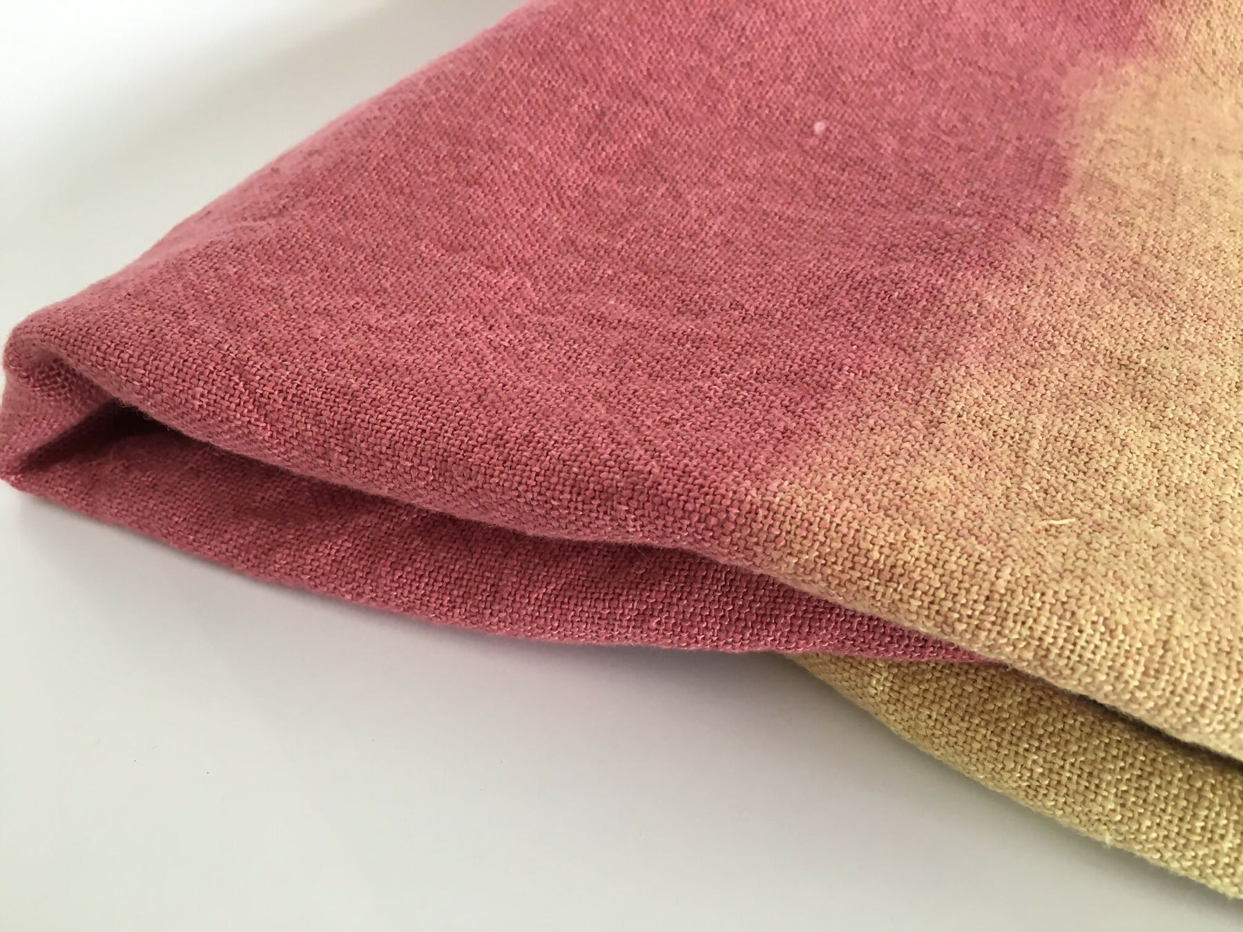Alegre combinación de tono rosa con amarillos en esta piecera de lino rústico 100% natural, todo teñido a mano con la técnica de Shibori o amarras.