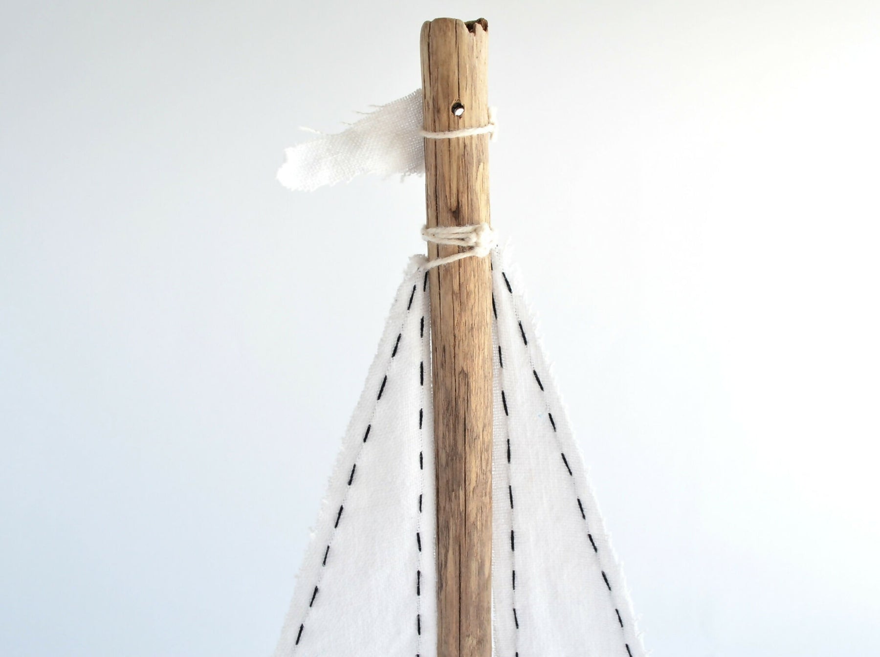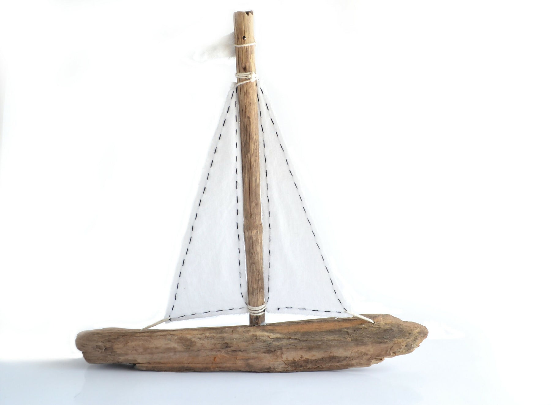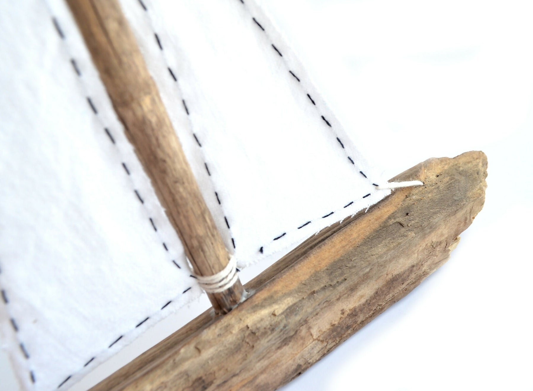 Precioso velero realizado con maderas recuperadas de la costa de Niebla en Valdivia, Región de los Ríos. Con una estructura simple e inspirado en los veleros de los juegos de antaño, tiene una linda vela en tela de algodón blanca con pespuntes oscuros en el borde.