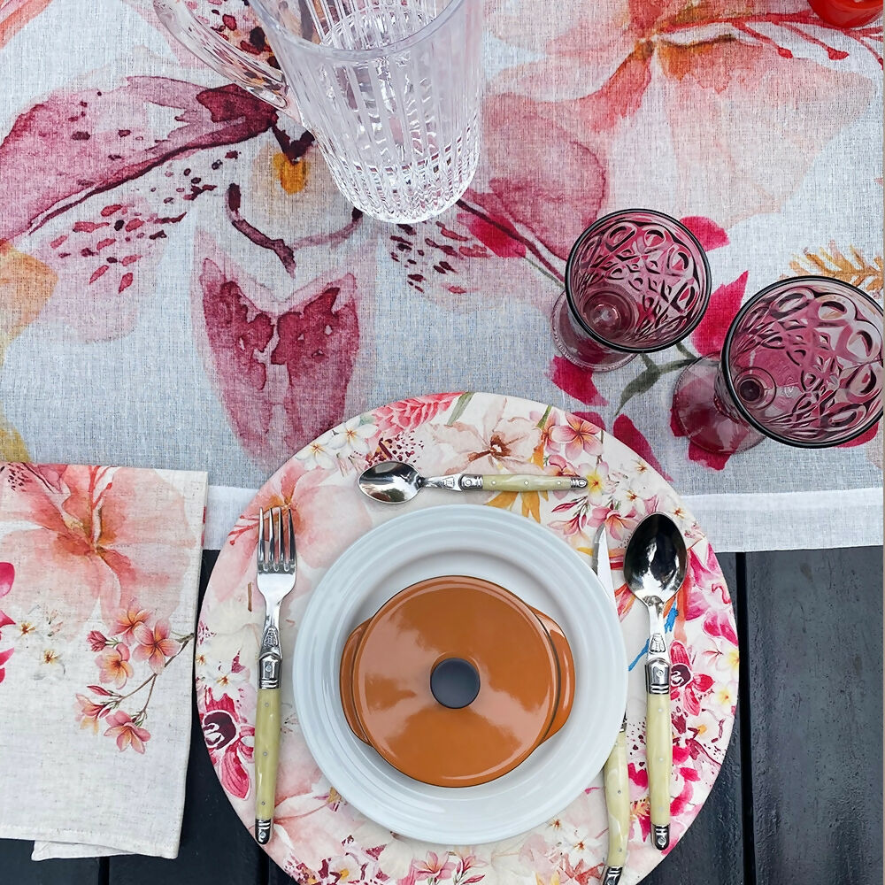 Camino de Mesa Hibiscus – Velo Organza (poliéster), estampado.