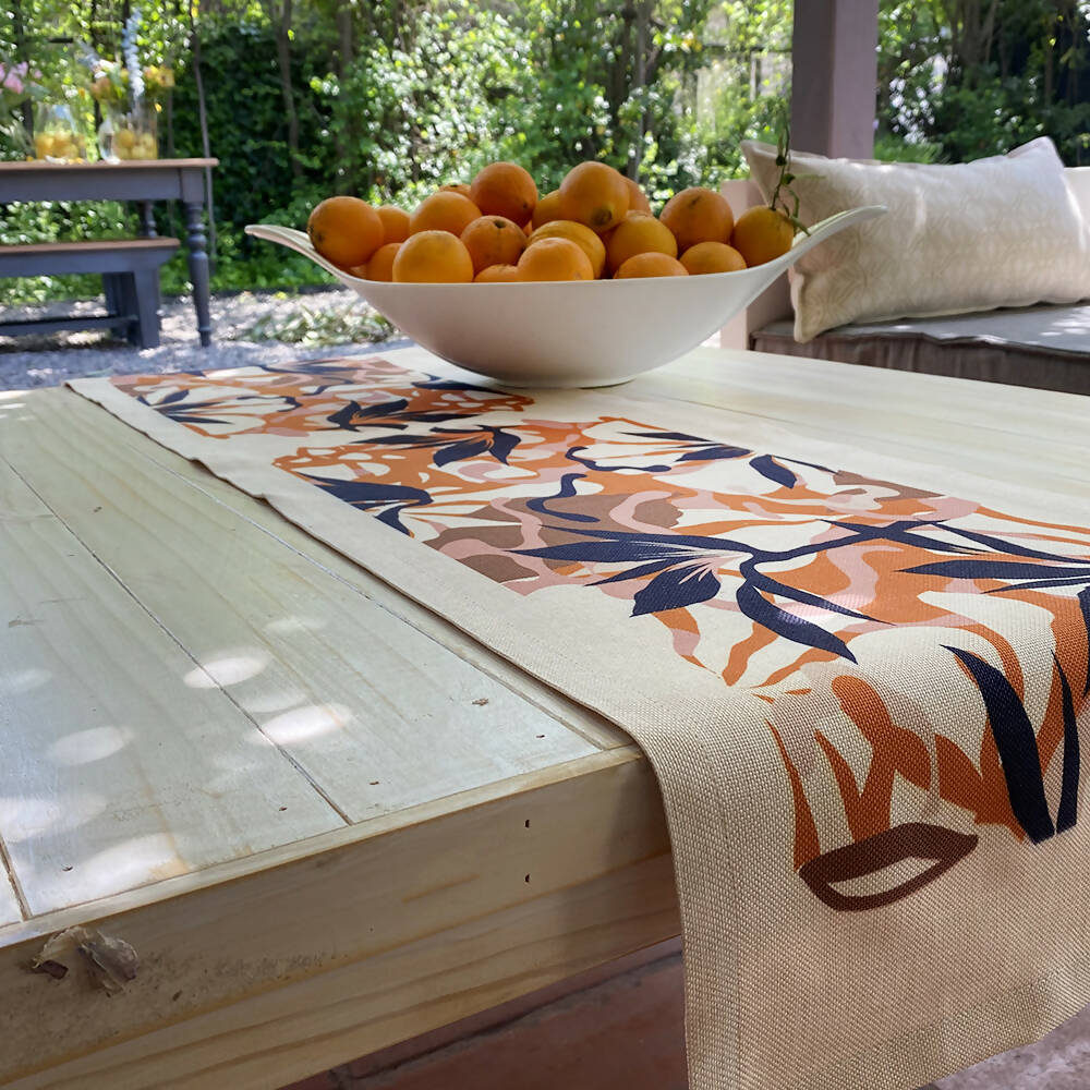 Camino de mesa en linet natural, estampado 150×36 cm.