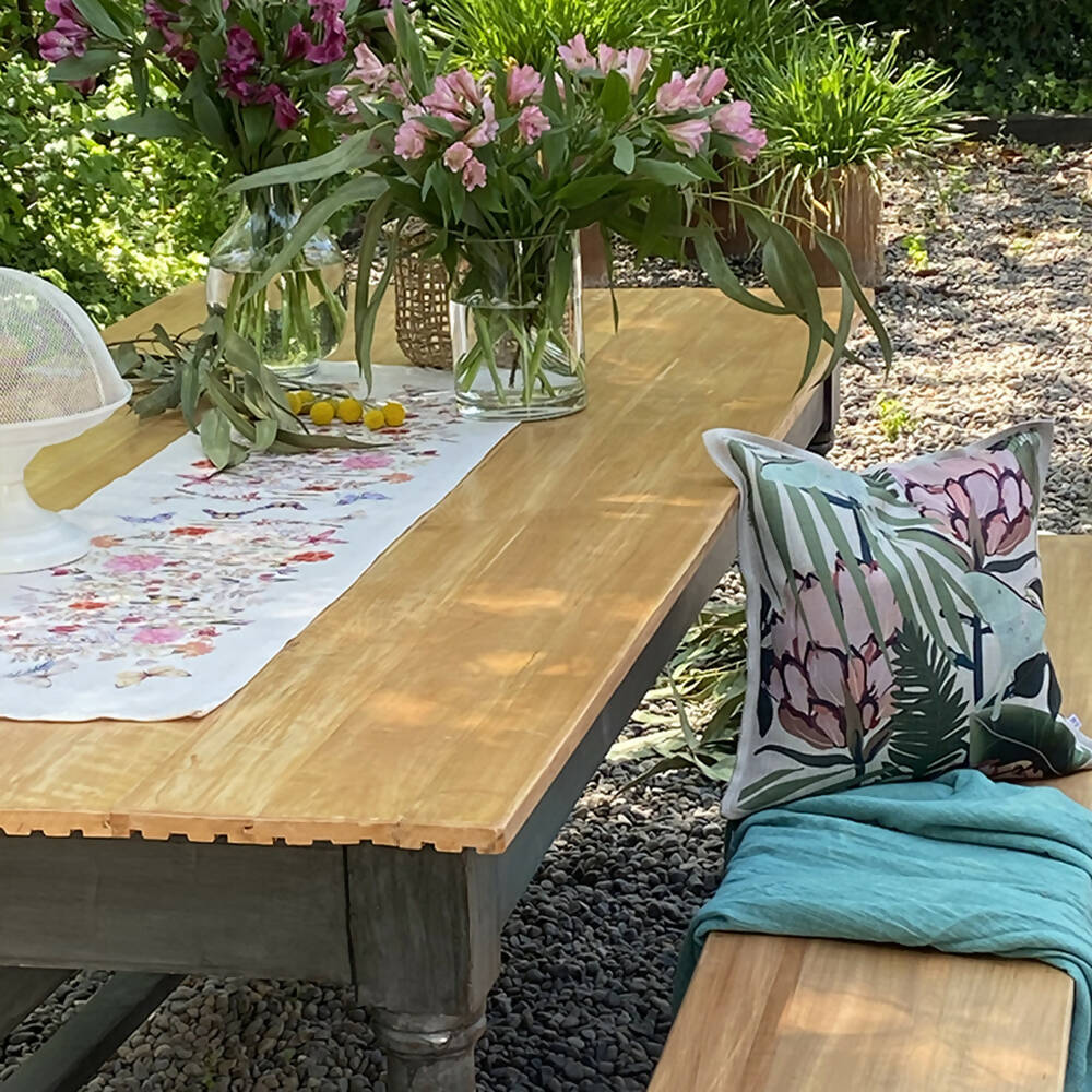 Camino de mesa en linet natural, estampado 150×36 cm.