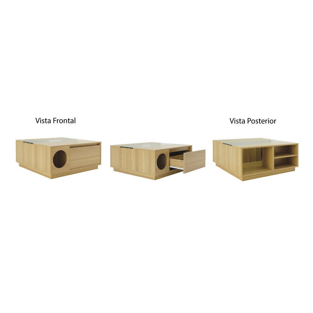 Una mesa de centro moderna con un nivel inferior pensado para convivir con tu mascota—diseño, orden y funcionalidad en un solo mueble.