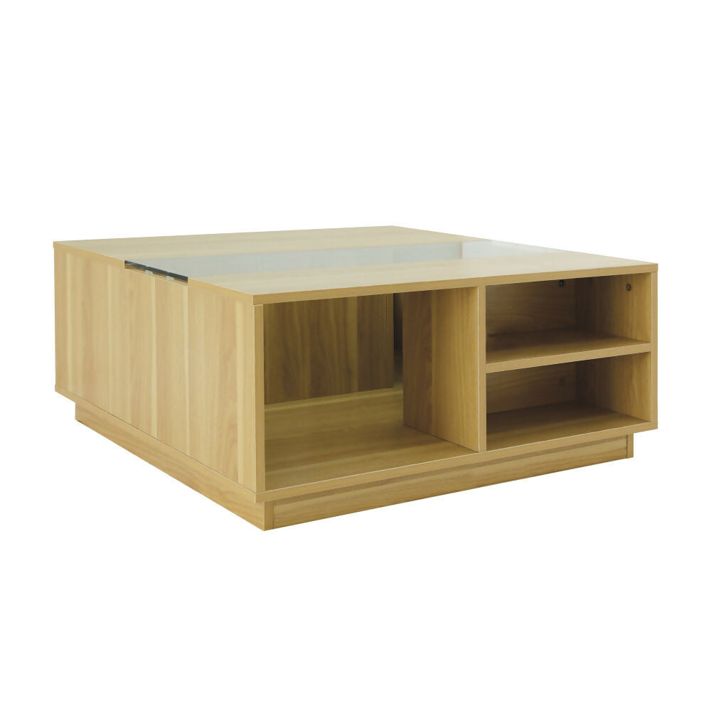 Materiales: engineered/MDF; cubierta de vidrio templado. Medidas aprox.: 80 × 80 × 36 cm.