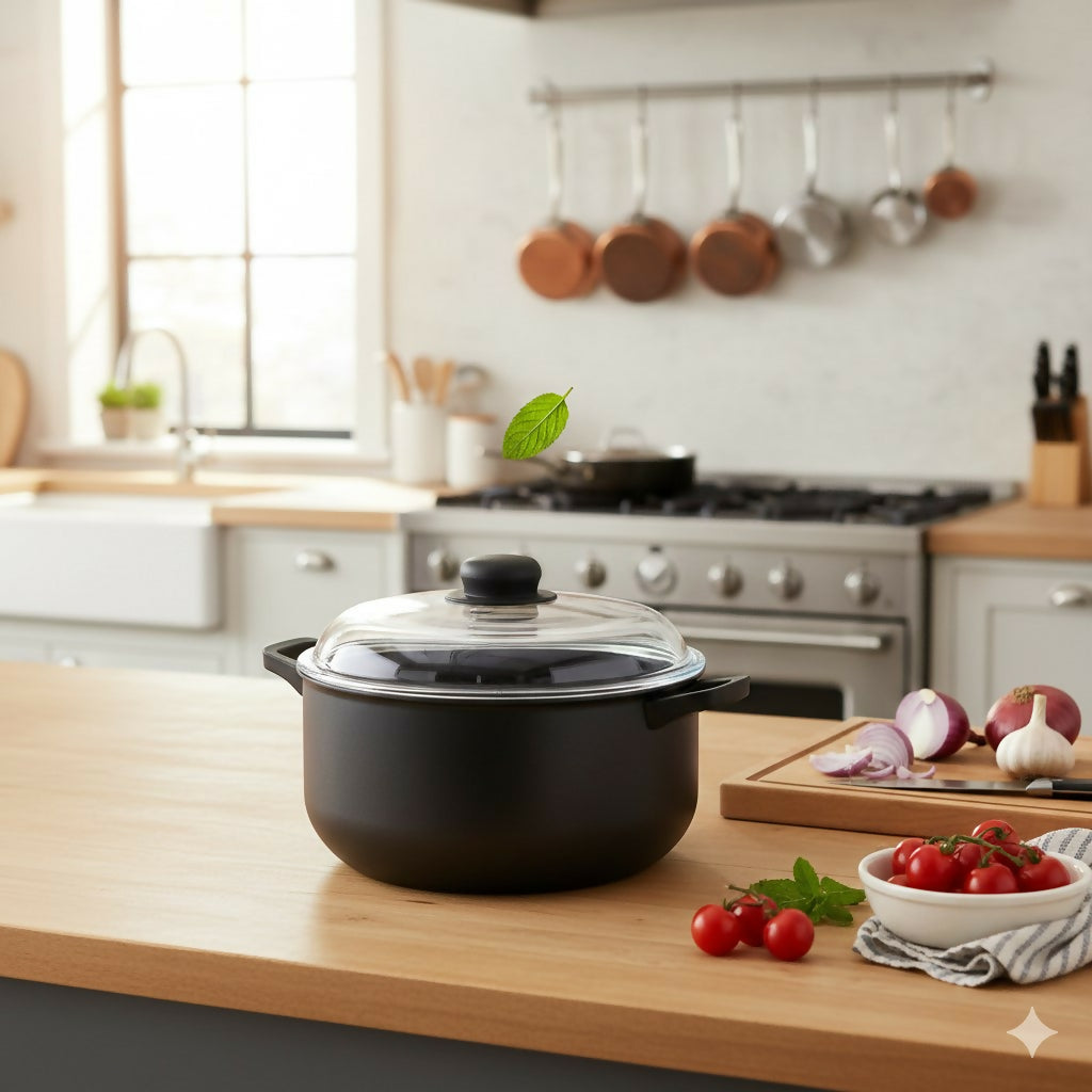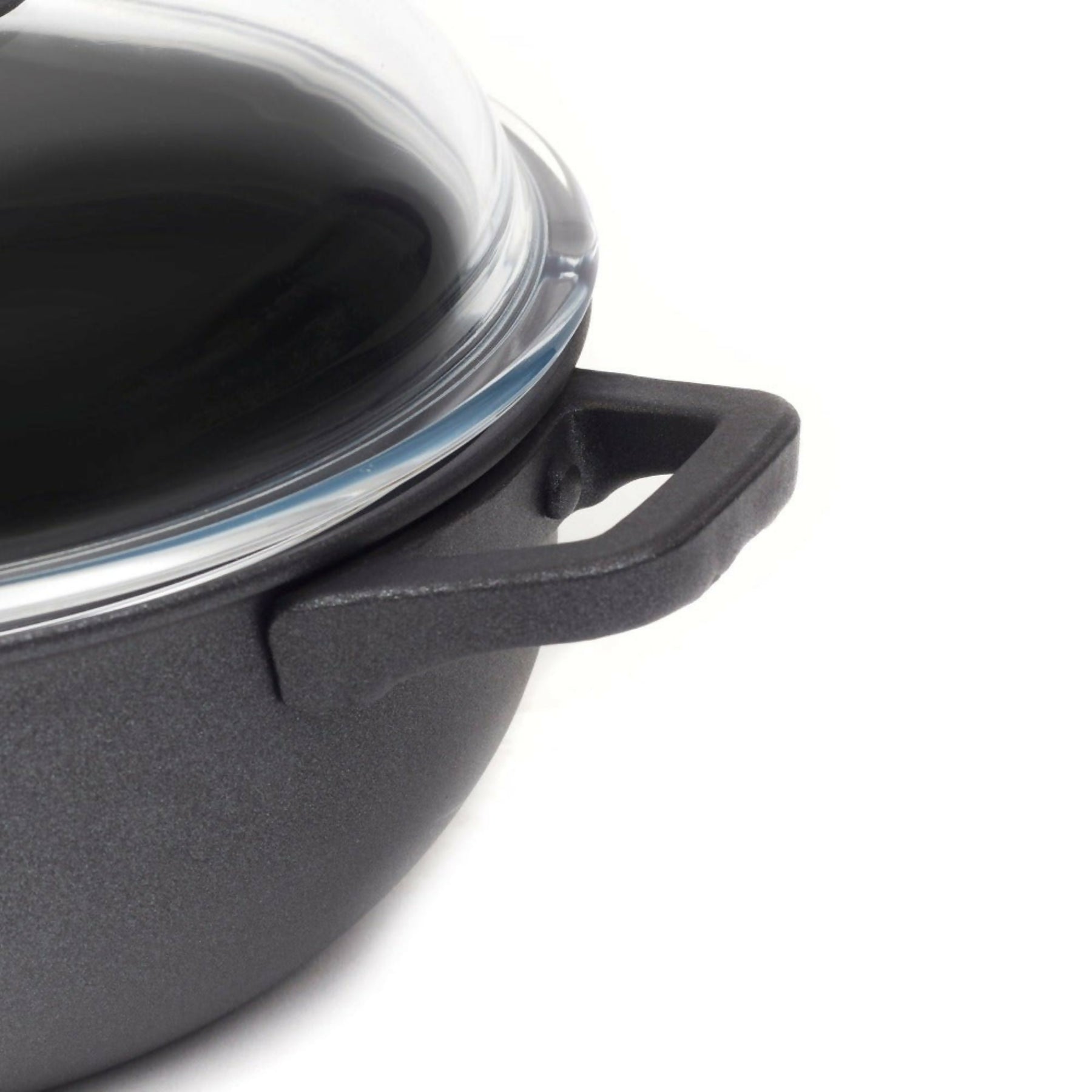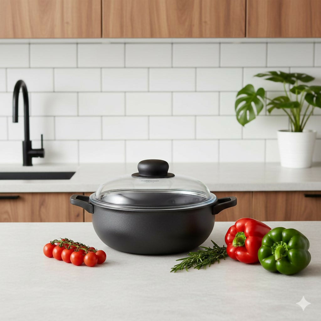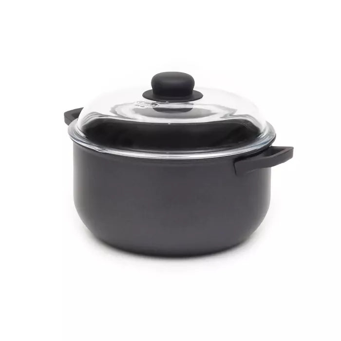 Olla c/tapa cristal templado, cuerpo y asas de aluminio forjado, full inducción base de acero inoxidable 0.6mm de espesor, antiadherente  ecológico (libre de PFOA y PTFE) marca Alemana Greblón fabricado en Portugal Comunidad Europea