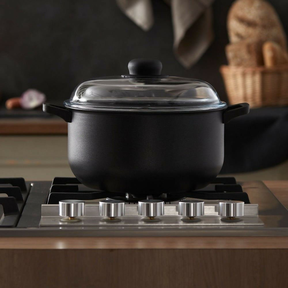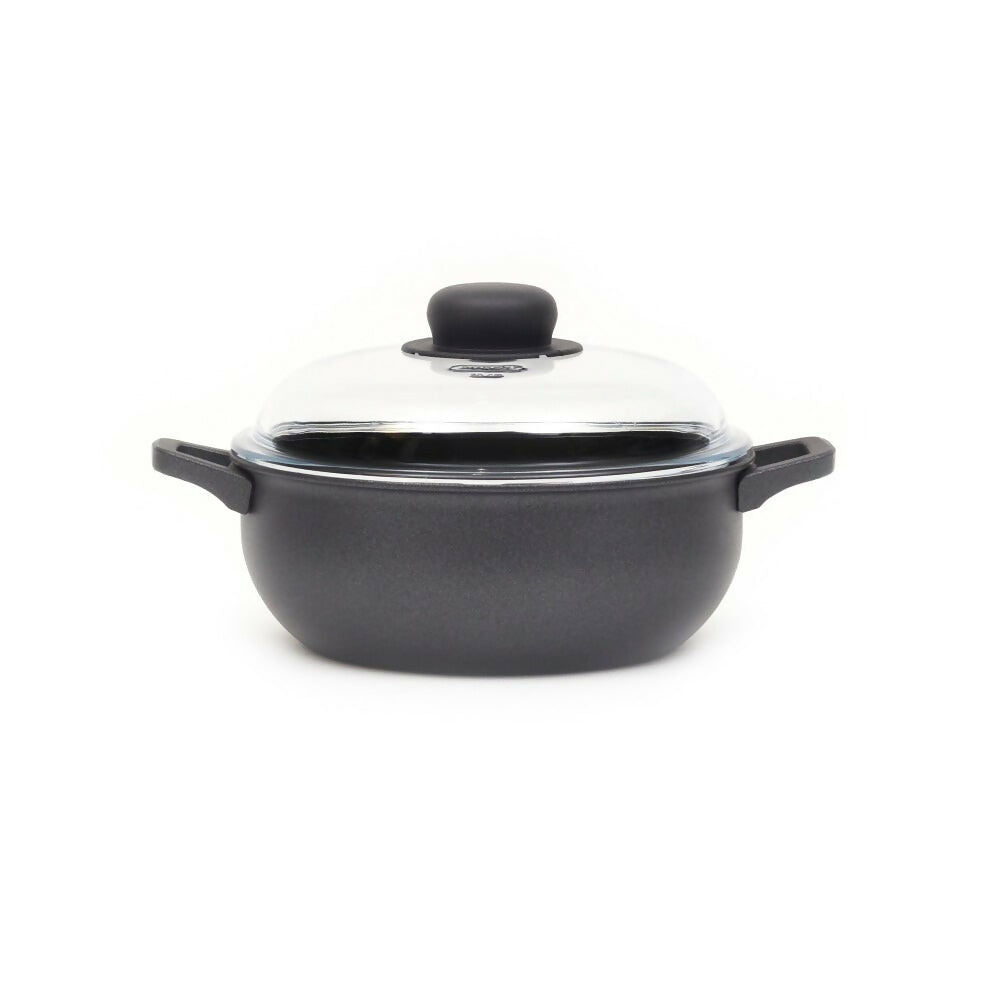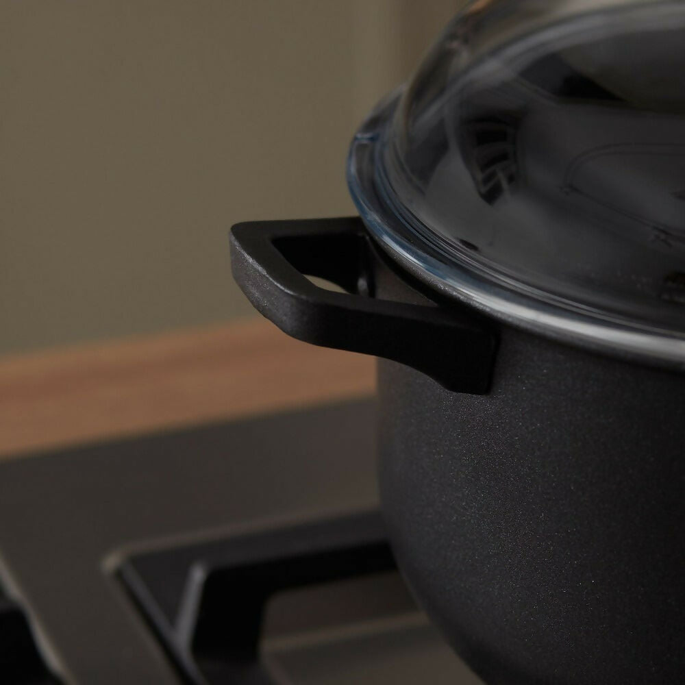 Olla c/tapa cristal templado, cuerpo y asas de aluminio forjado, full inducción base de acero inoxidable 0.6mm de espesor, antiadherente  ecológico (libre de PFOA y PTFE) marca Alemana Greblón fabricado en Portugal Comunidad Europea