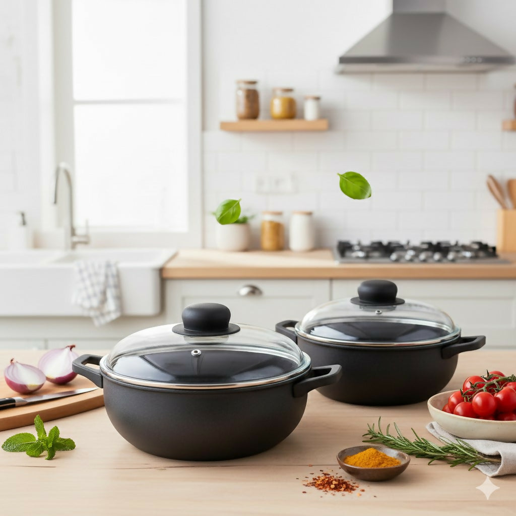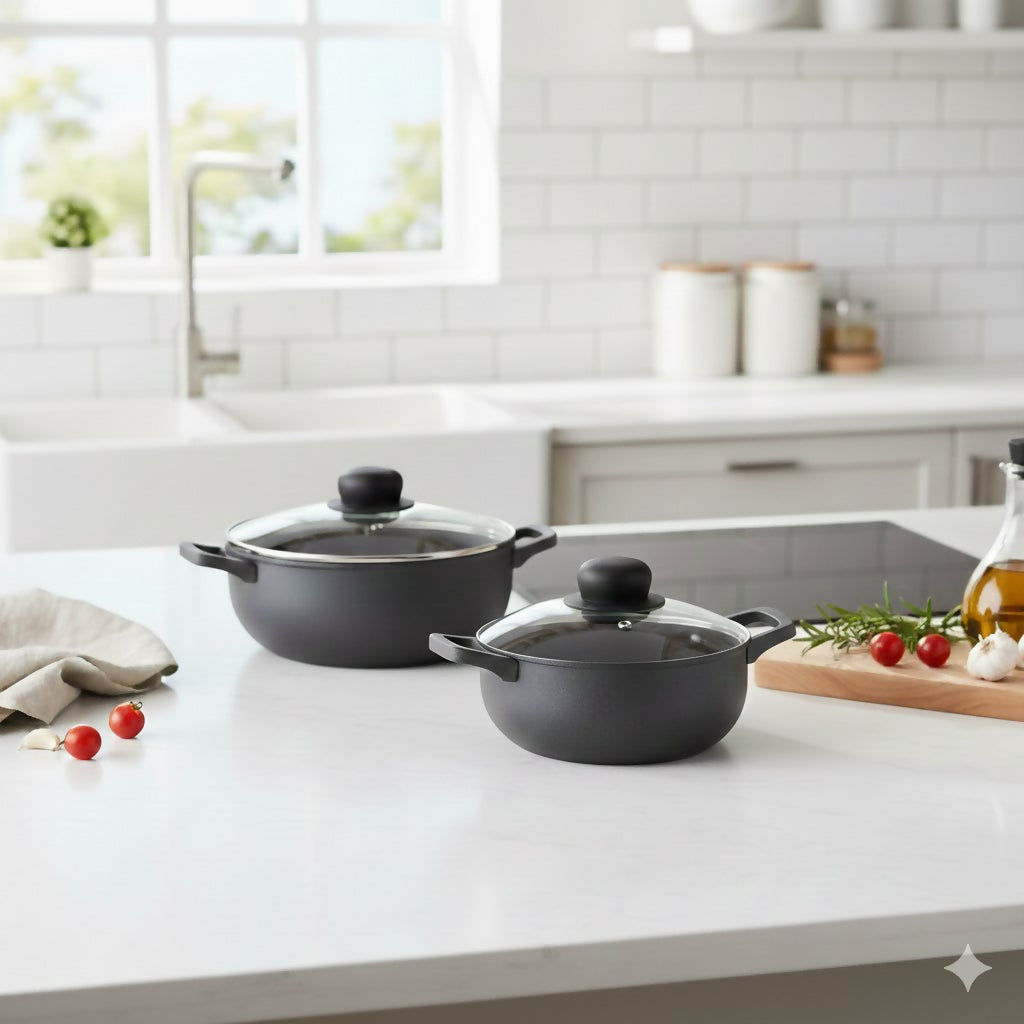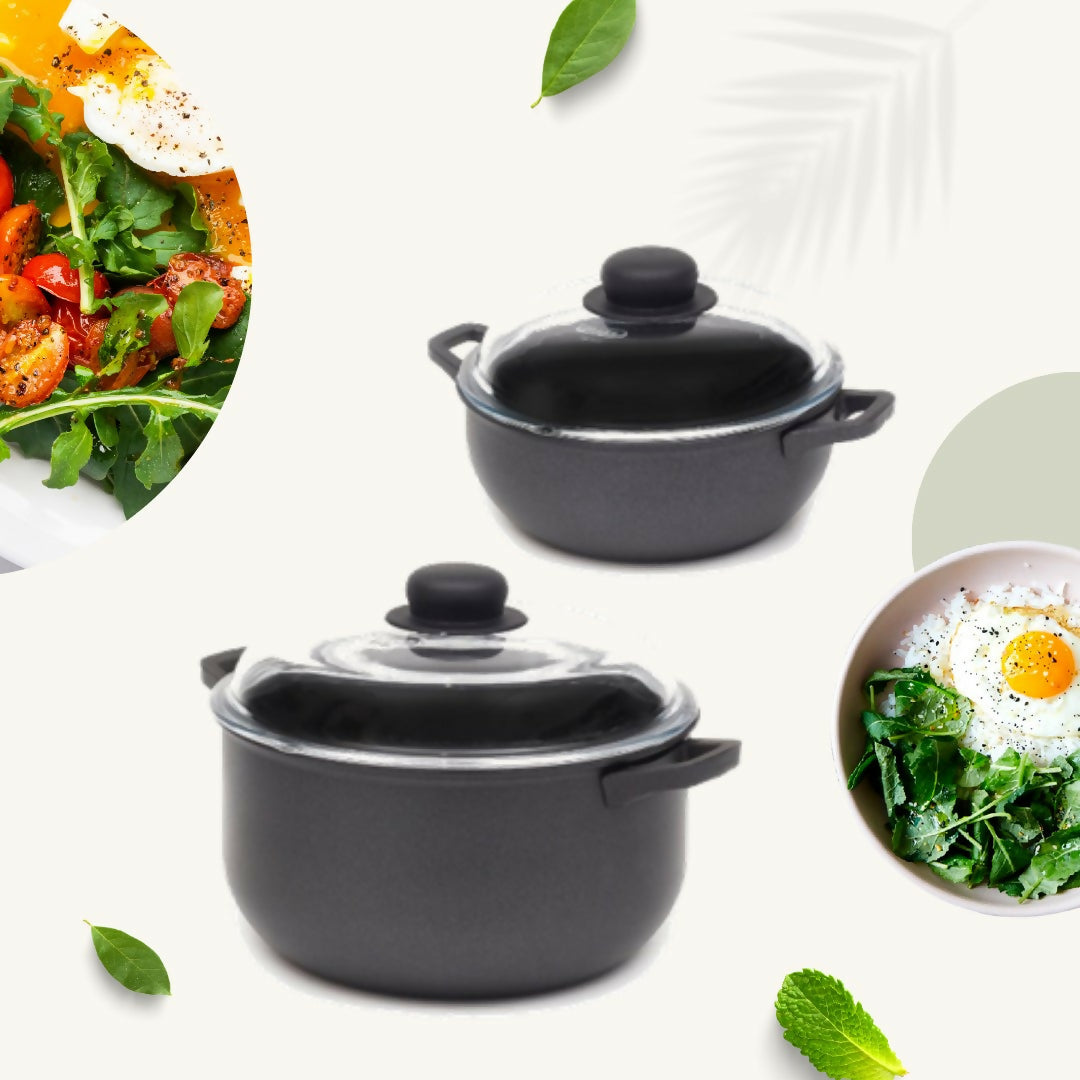 Set 2 Olla c/tapa cristal templado modelo Athenea tamaño 26cm Alta ytamaño 24cm Baja, cuerpo y asas de aluminio forjado, full inducción base de acero inoxidable 0.6mm de espesor, antiadherente  ecológico (libre de PFOA y PTFE) marca Alemana Greblón fabricado en Portugal Comunidad Europea