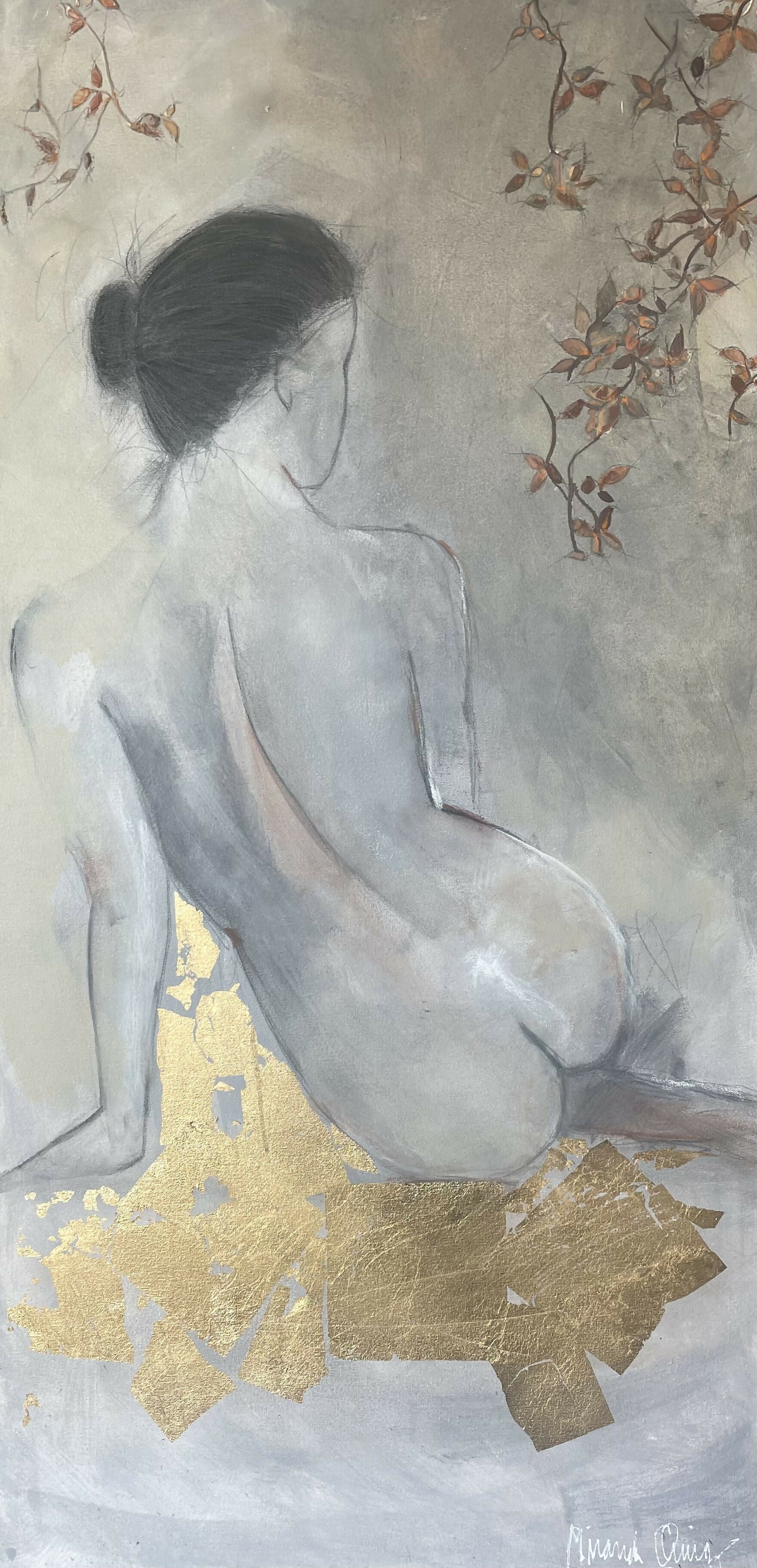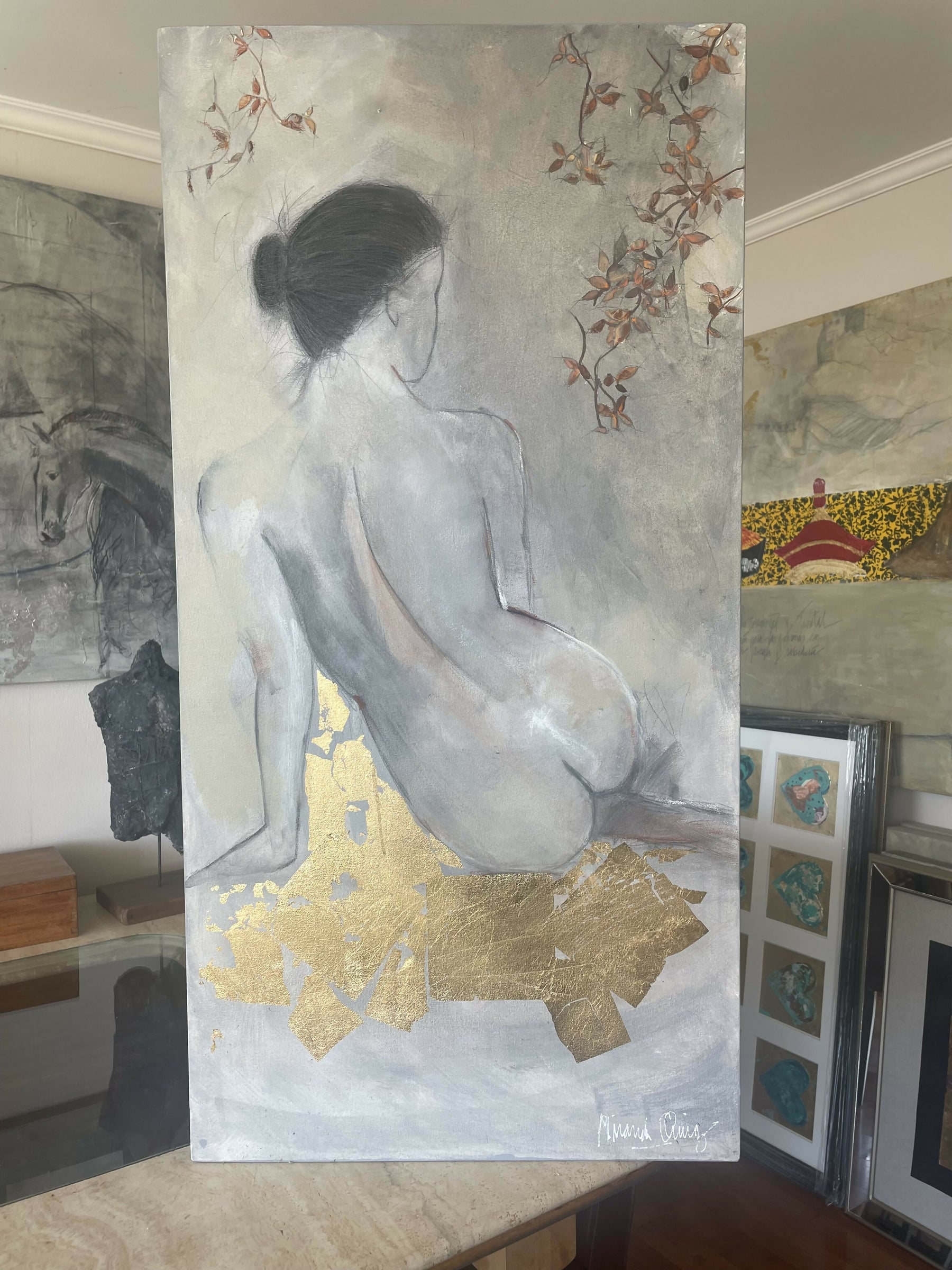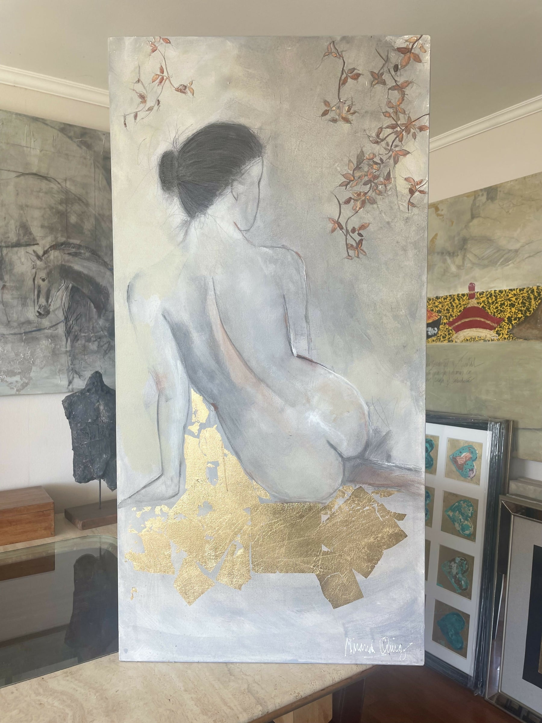 técnica mixta, acrílico, tintas, mina, pastel seco, pastas con polvo de cuarzo y lámina de oro