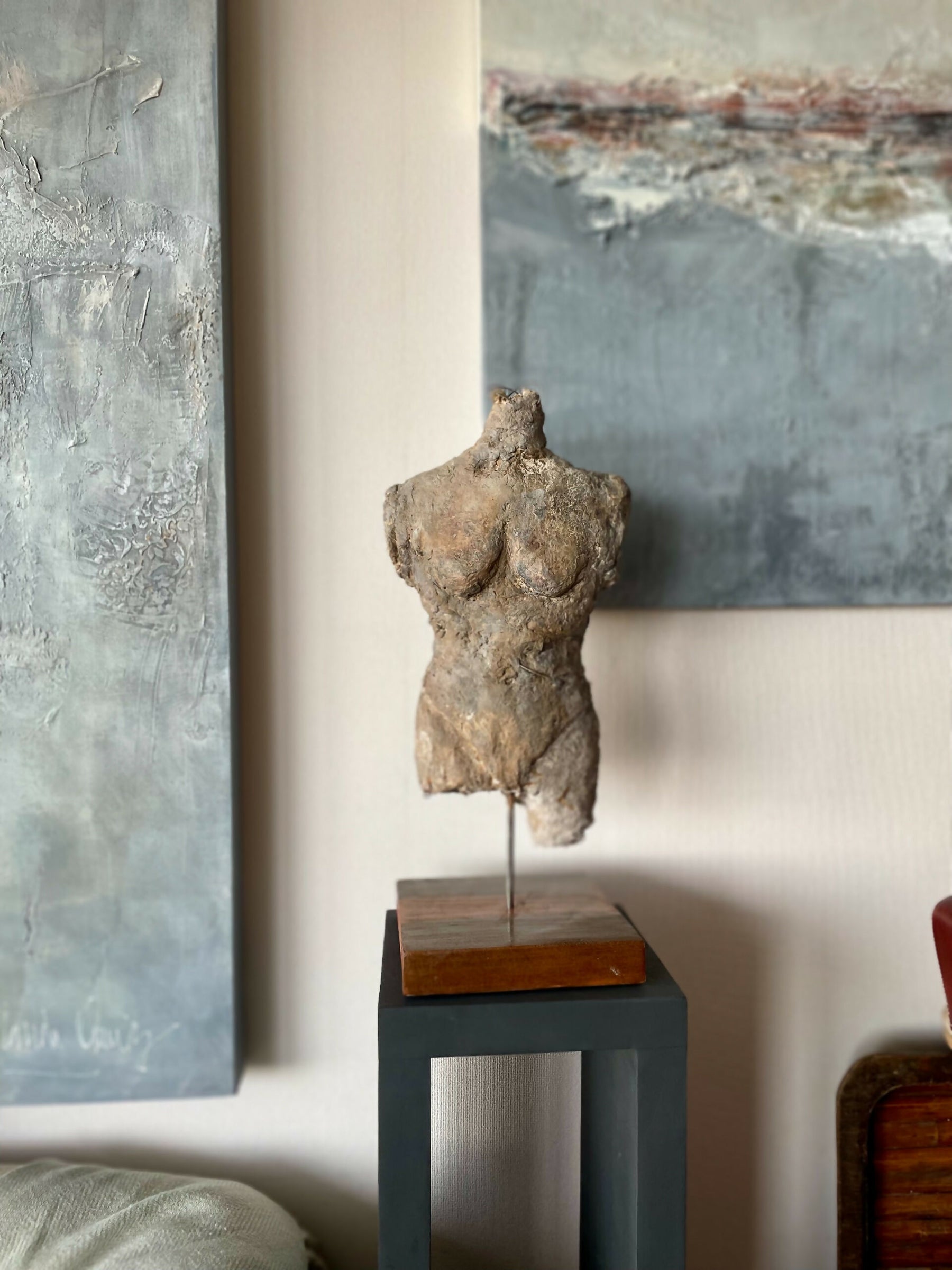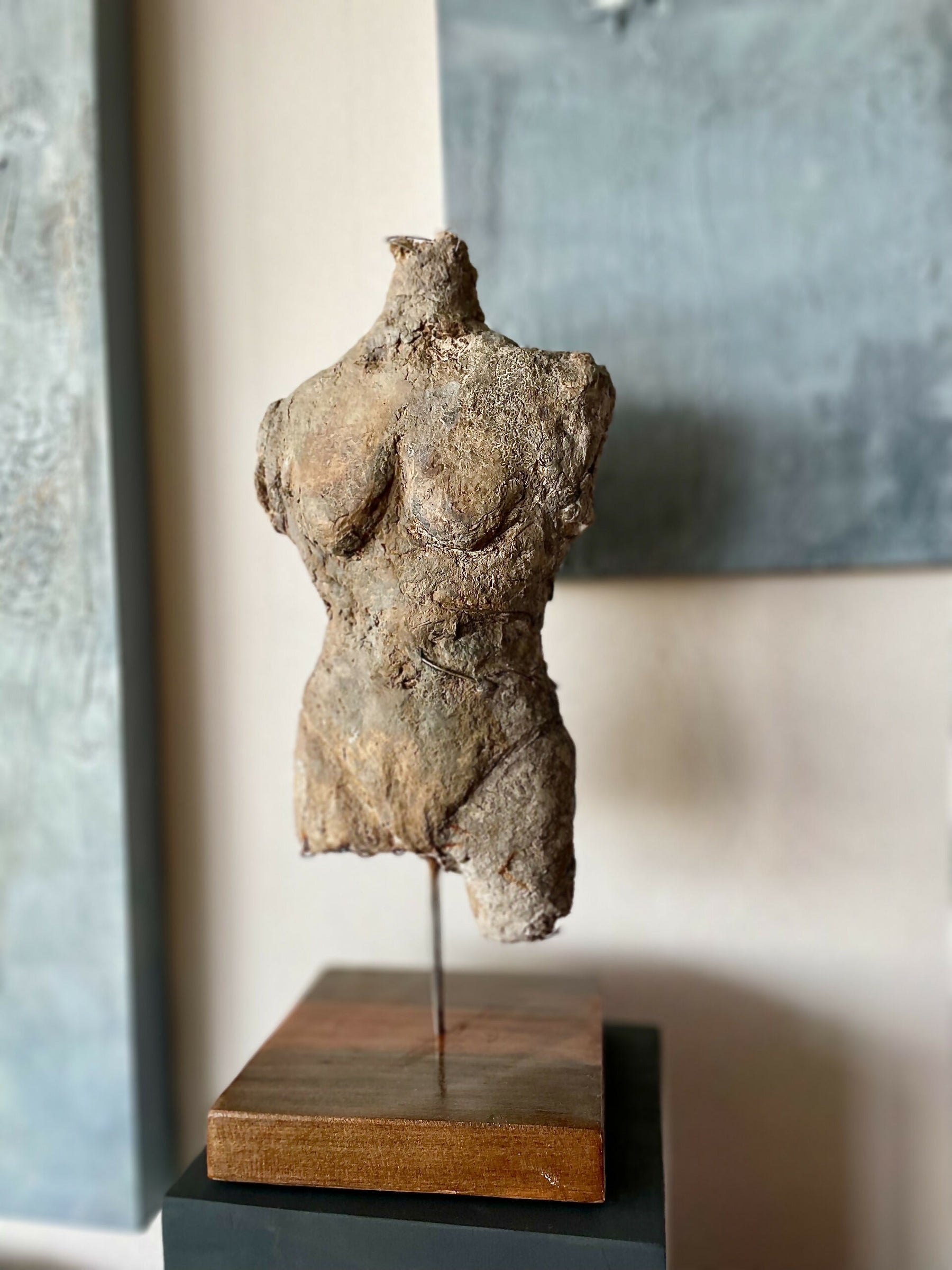 Esqueleto de alambre recubierto con pasta de cuarzo patinados a fuego. Montados sobre pedestal de roble antiguo de 20x20cms.