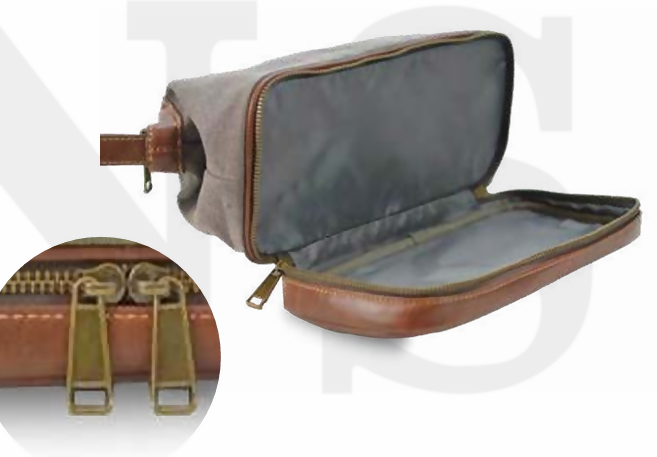 Neceser en tela canva combinado con símil cuero. Apertura superior con cierre. Arco metálico estructural que permite un cómo acceso al interior. Doble bolsillo interno, con cierre y otro abierto con división. Base con cierres que actúa como bolsillo extra