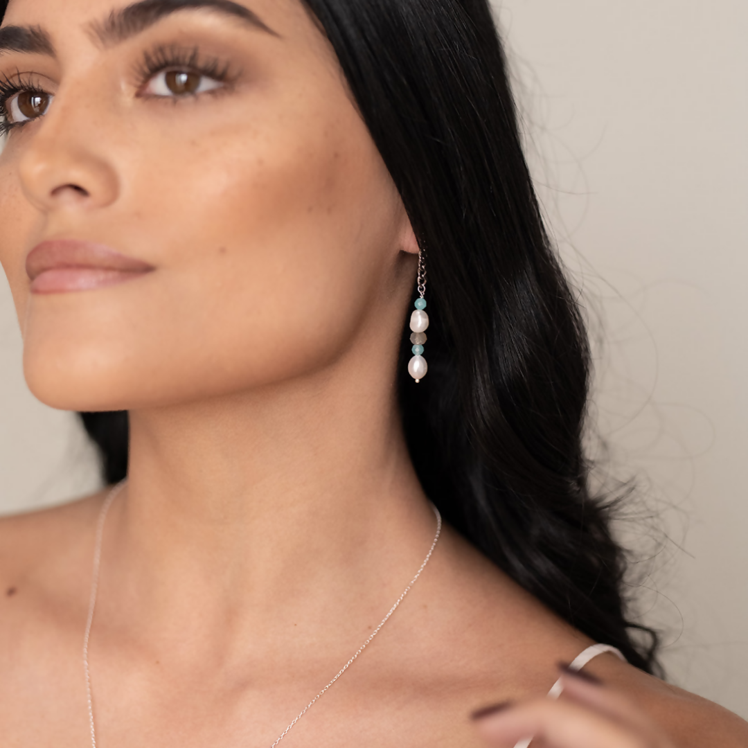 - Plata ley 925, perlas naturales y piedras semipreciosa facetadas (labradorita, calcedonia). Hipoalergenicos, sin níquel.
