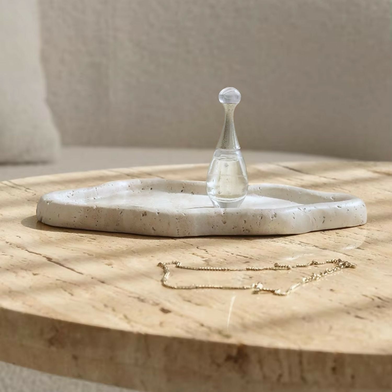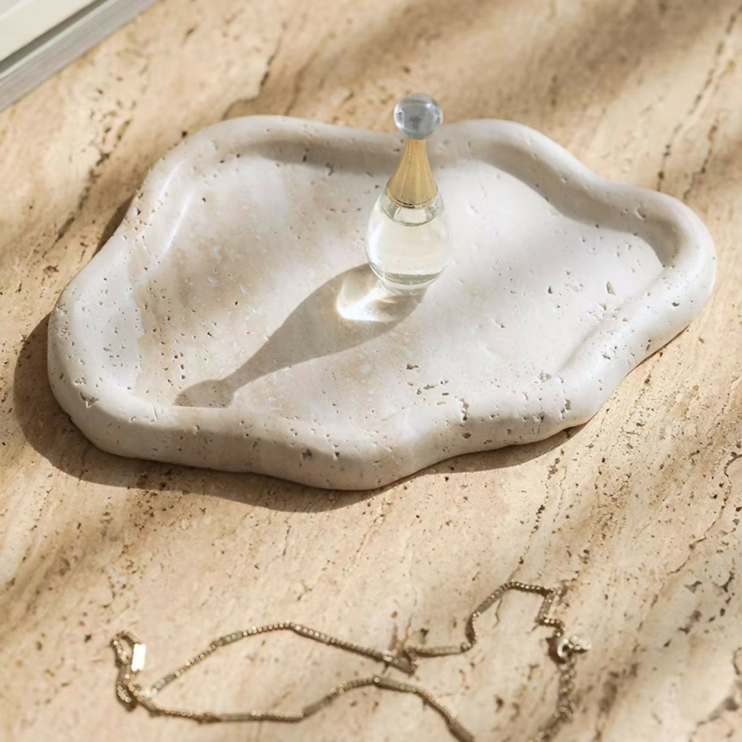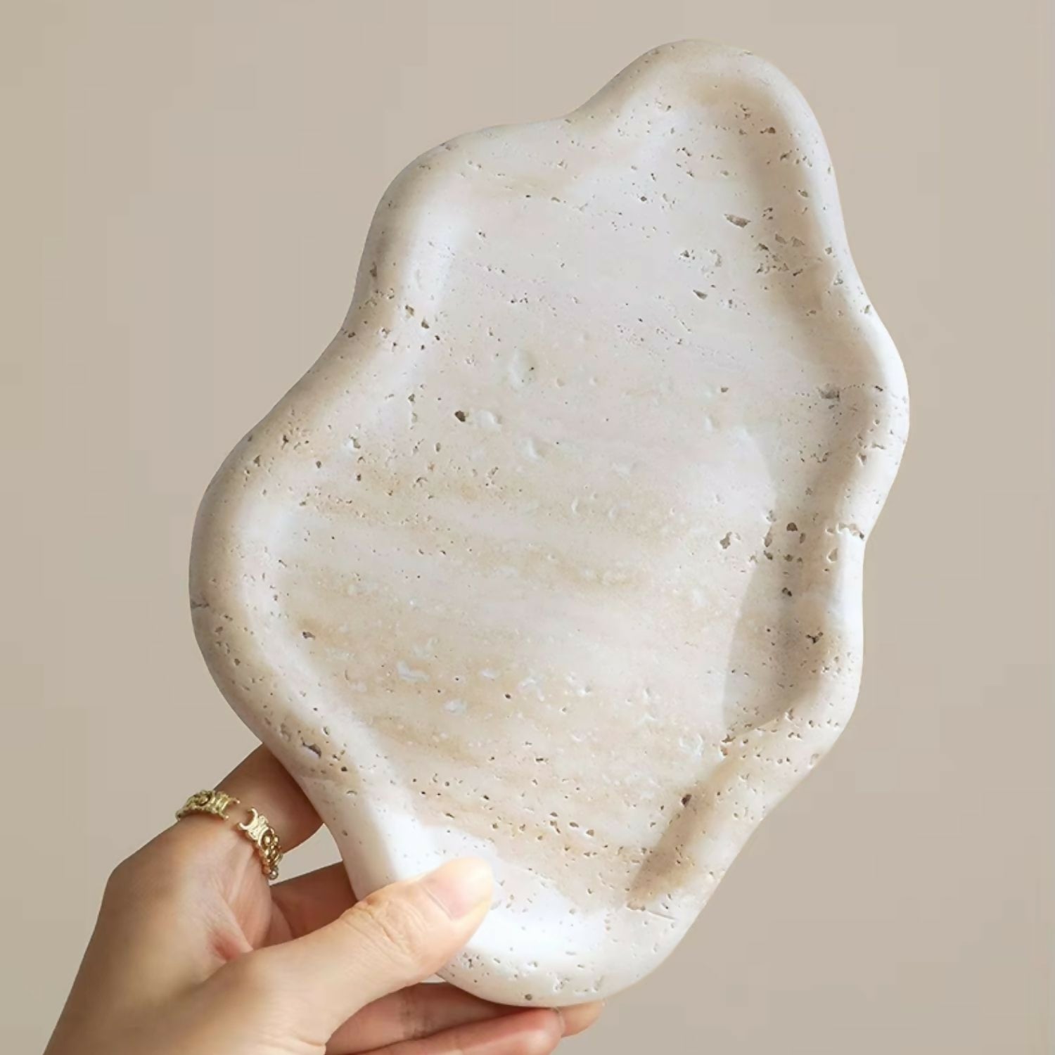 La Bandeja de Piedra Irregular Cloud Travertino es una pieza decorativa única que destaca por su diseño orgánico y contemporáneo. Su silueta irregular con bordes redondeados tipo nube aporta suavidad visual, mientras que su borde grueso ofrece mayor seguridad, evitando que pequeños objetos se deslicen o derramen.